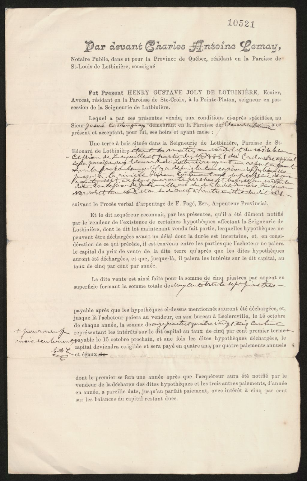 - Vente de terre par Henri-Gustave Joly à Josué Castonguay