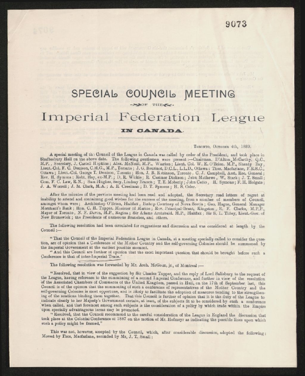 - Rapport d'une réunion de la ligue de la fédération impériale du Canada