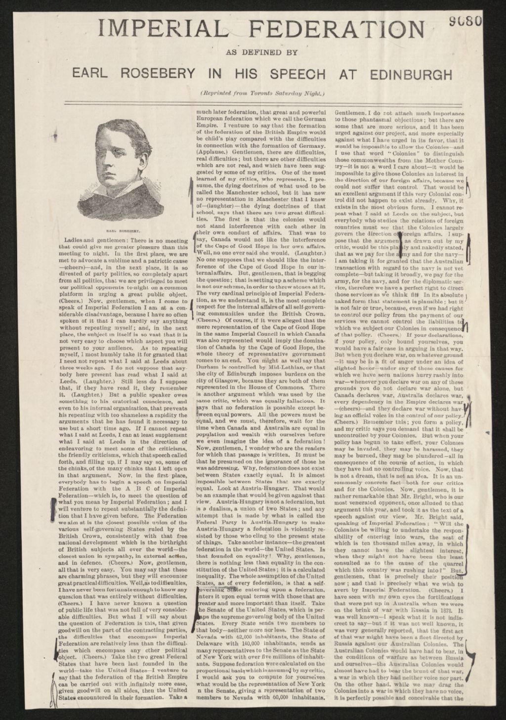 Discours du comte Rosebery à Édimbourg sur la fédération impériale, vers 1889, Archives nationales à Québec, Fonds Famille Joly de Lotbinière, (03Q,P351,S4,SS2,P9080).