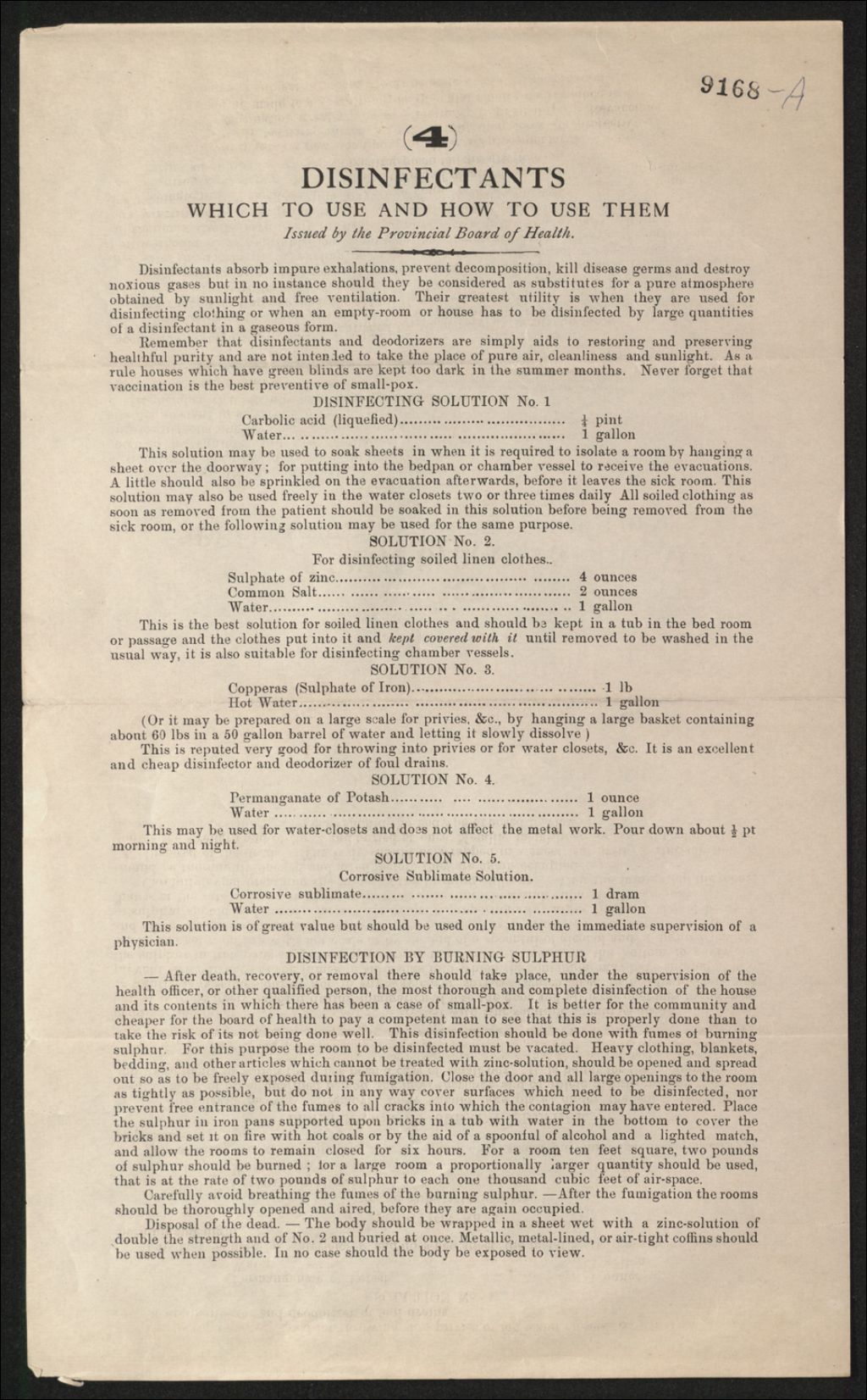 Bureau provincial d'hygiène. Désinfectants à employer, vers 1885, Archives nationales à Québec, Fonds Famille Joly de Lotbinière, (03Q,P351,S4,SS2,P9168A).
