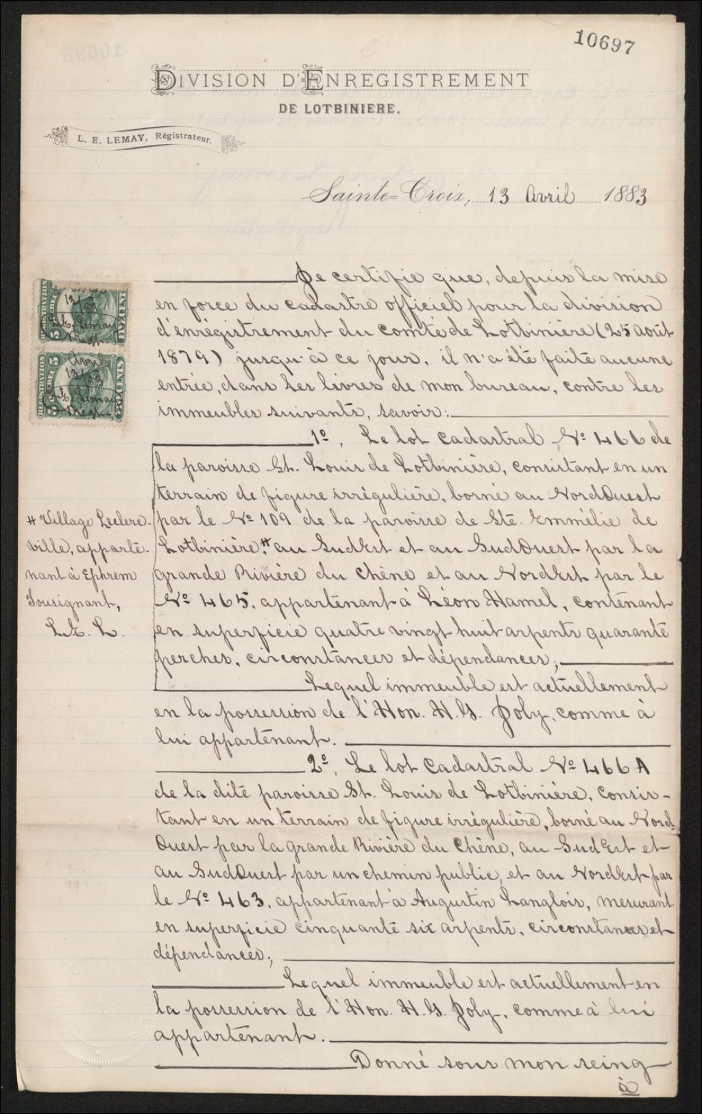Certificat constatant qu'aucune hypothèque n'existe sur les lots no 466 et 466A, 1883, Archives nationales à Québec, Fonds Famille Joly de Lotbinière, (03Q,P351,S4,SS3,P10697).