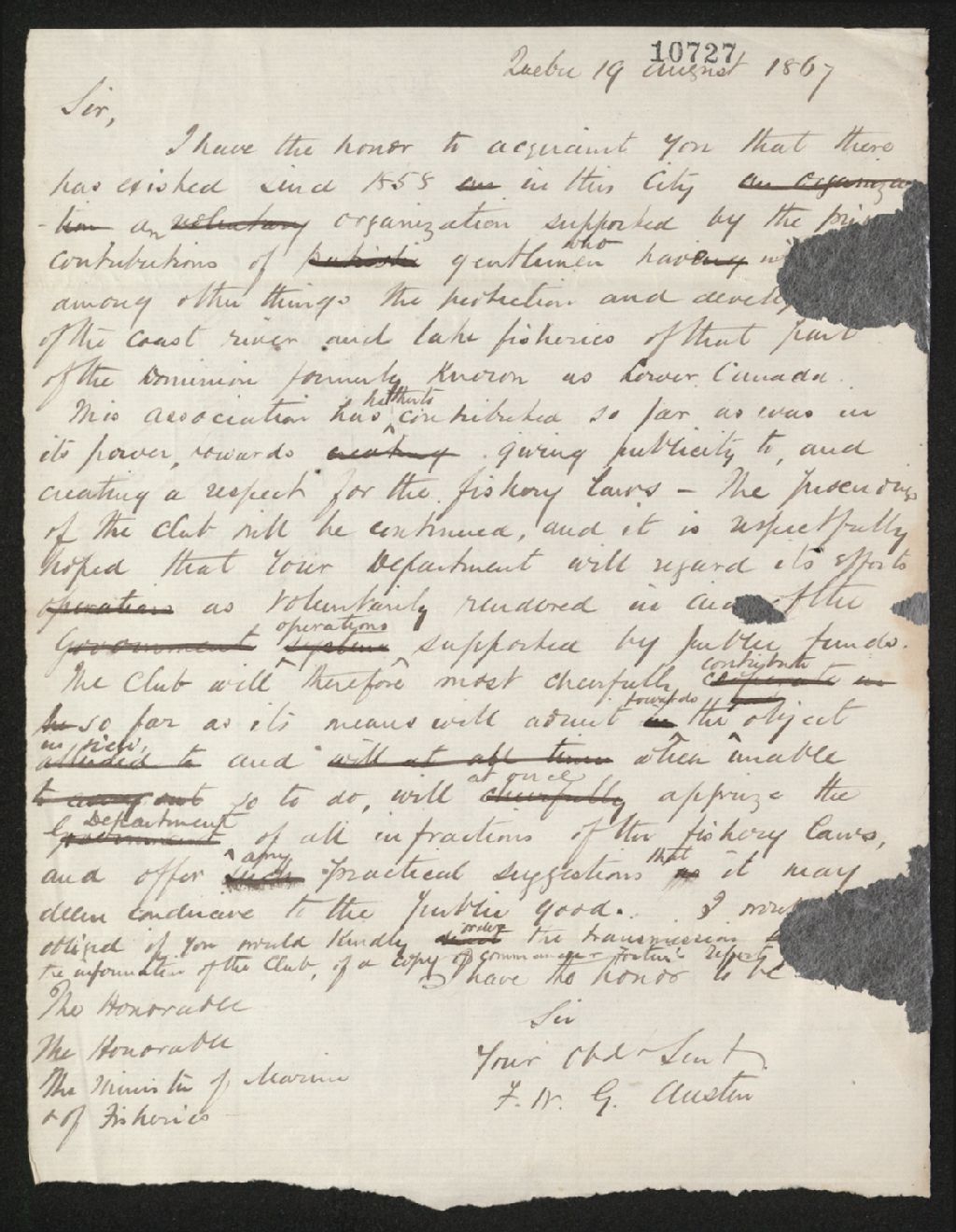 Brouillon de lettre de F. W. G. Austin au ministre de la marine et des pêcheries, 1867, Archives nationales à Québec, Fonds Famille Joly de Lotbinière, (03Q,P351,S4,SS3,P10727).