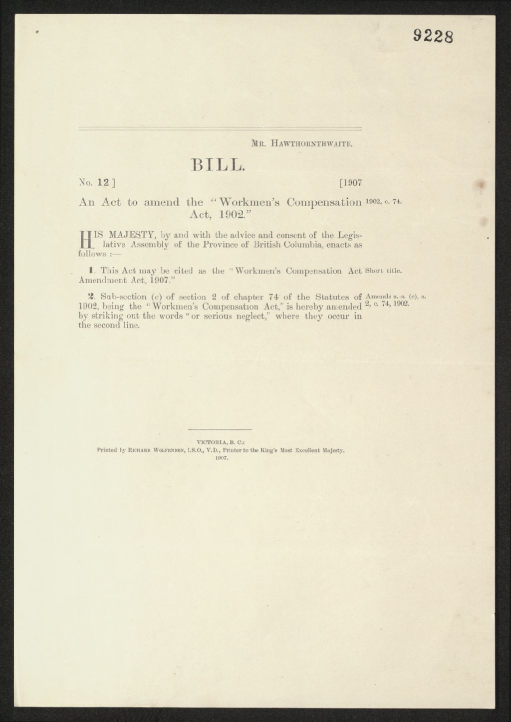 An act to amend the "Workmen's Compensation", 1907, Archives nationales à Québec, Fonds Famille Joly de Lotbinière, (03Q,P351,S4,SS2,P9228).