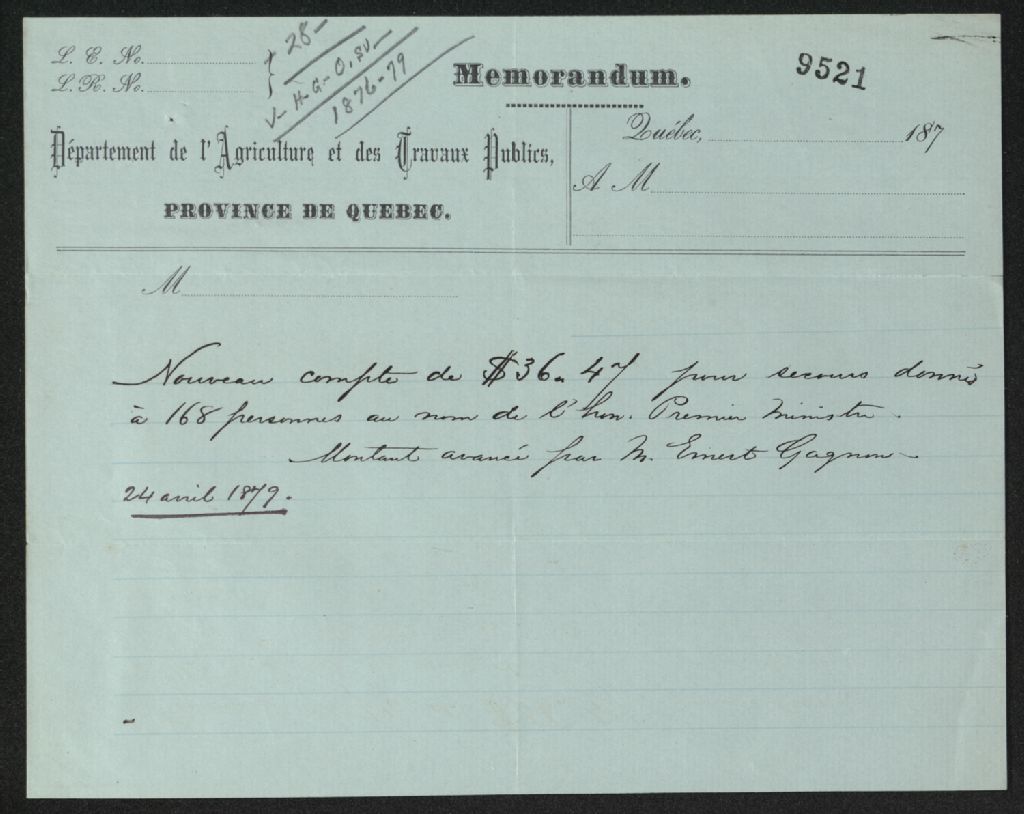 Mémoire, 1879, Archives nationales à Québec, Fonds Famille Joly de Lotbinière, (03Q,P351,S4,SS2,P9521).