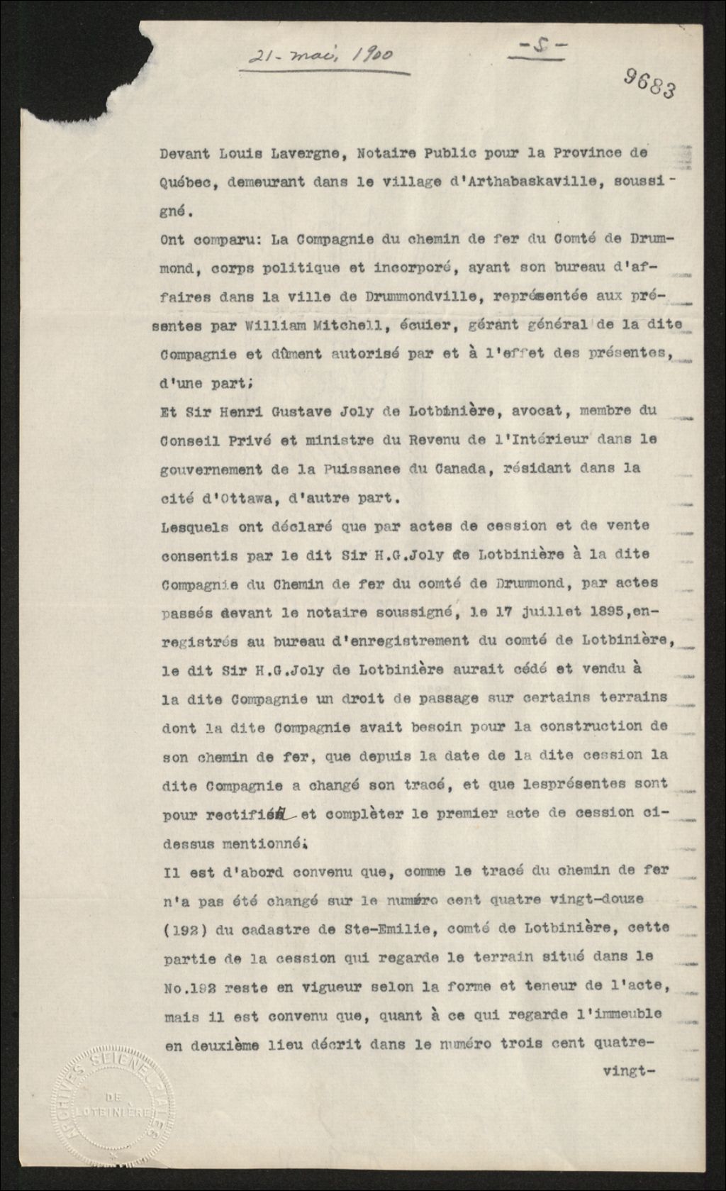 Acte d'accord entre la Compagnie de chemin de fer du comté de Drummond et Henri-Gustave Joly