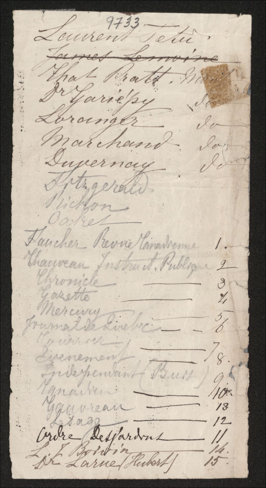 Liste de noms, vers 1872, Archives nationales à Québec, Fonds Famille Joly de Lotbinière, (03Q,P351,S4,SS2,P9733).
