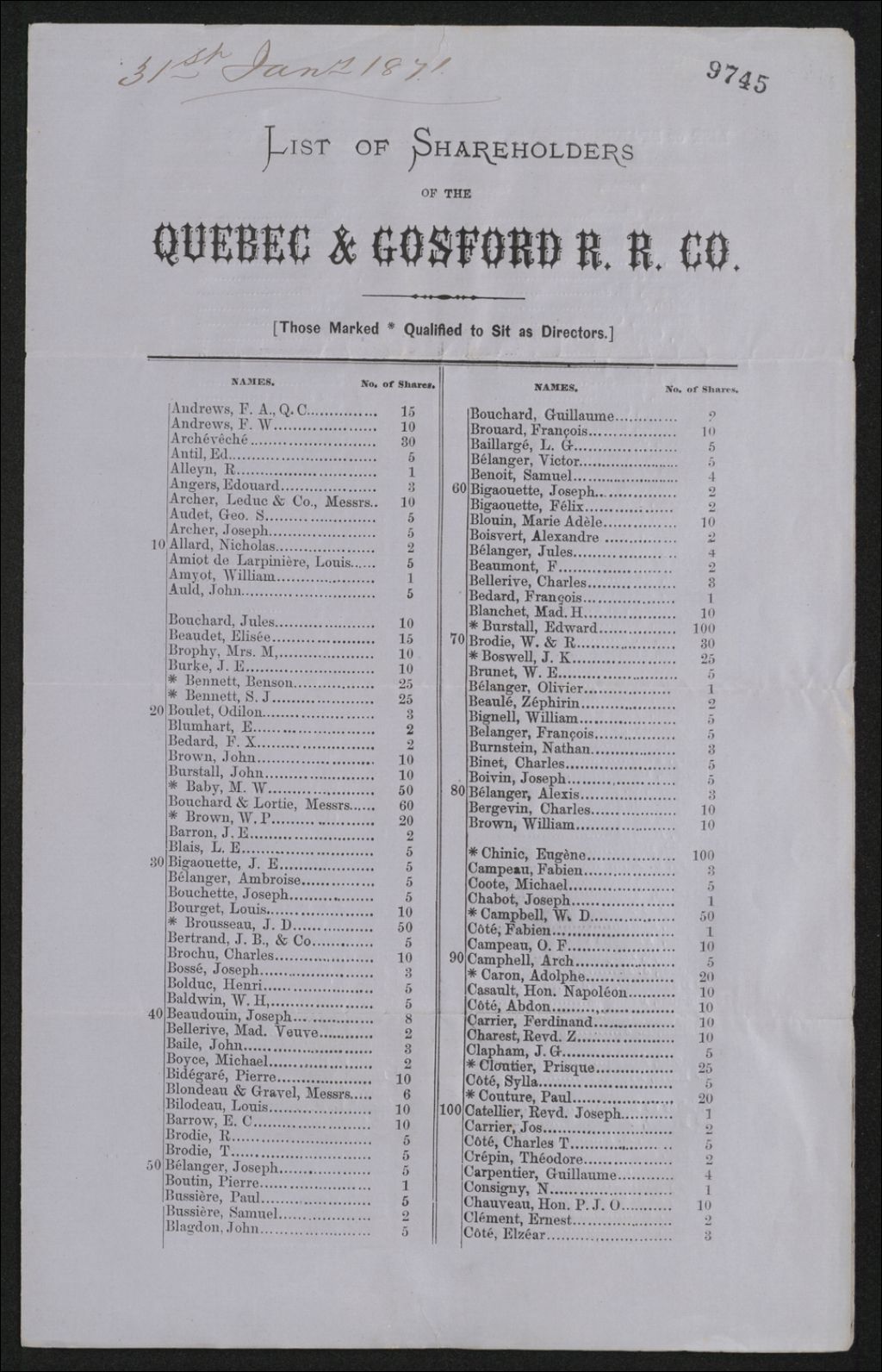 - Liste des actionnaires du Chemin de fer Québec & Gosford