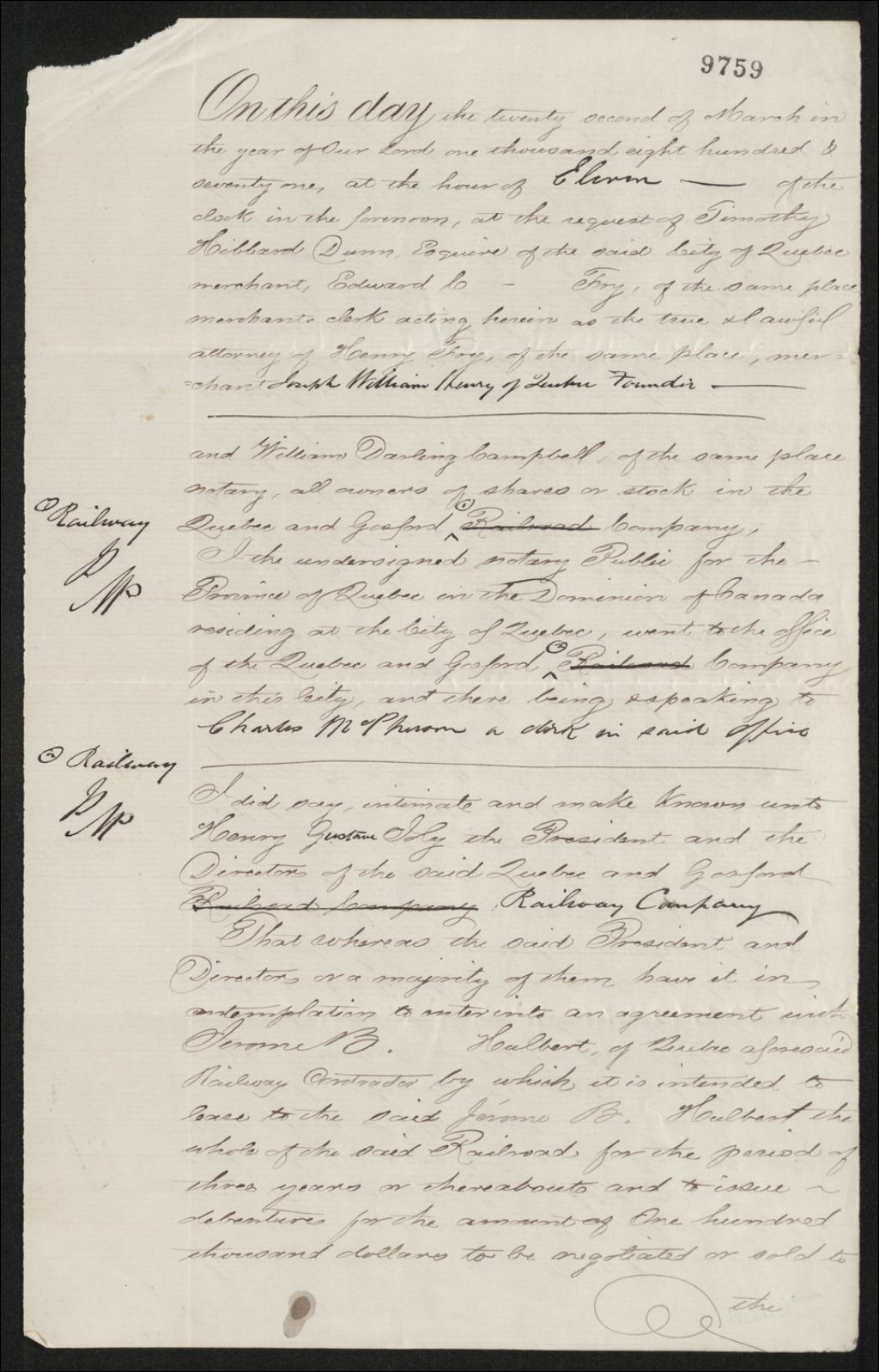 Protêt à la requête de T. H. Dunn & al. contre le président et directeur du Chemin de fer Québec & Gosford, 1871, Archives nationales à Québec, Fonds Famille Joly de Lotbinière, (03Q,P351,S4,SS2,P9759).
