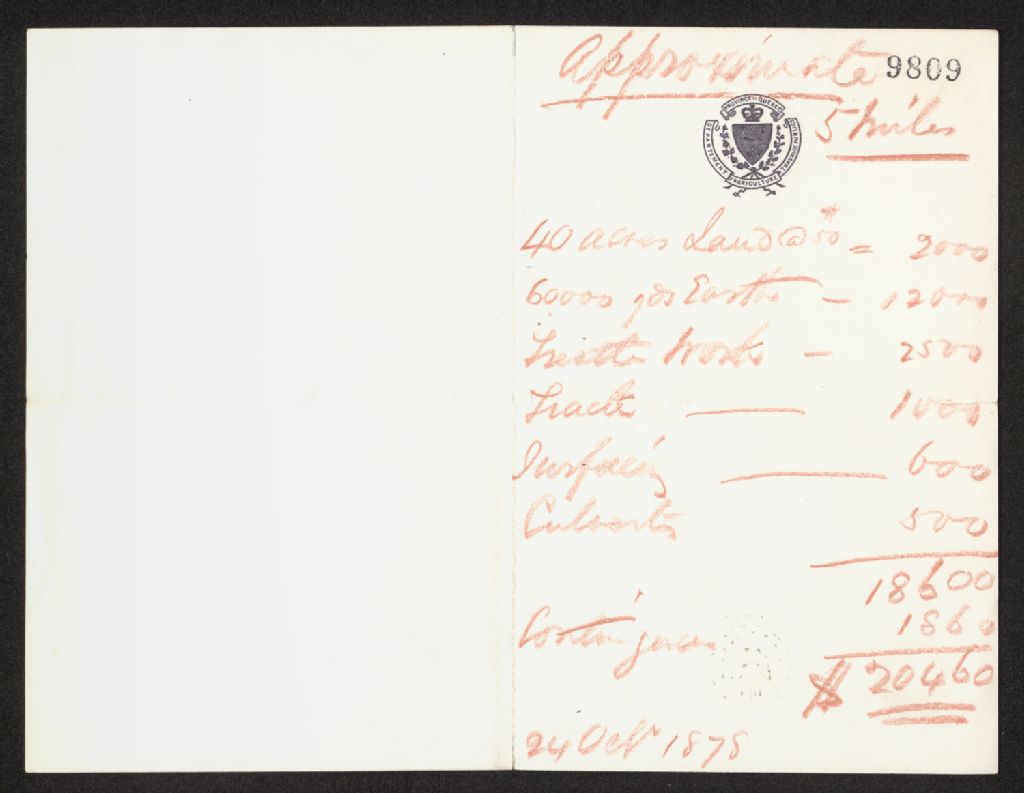 Estimation du coût des travaux pour la ligne temporaire, 1878, Archives nationales à Québec, Fonds Famille Joly de Lotbinière, (03Q,P351,S4,SS2,P9809).