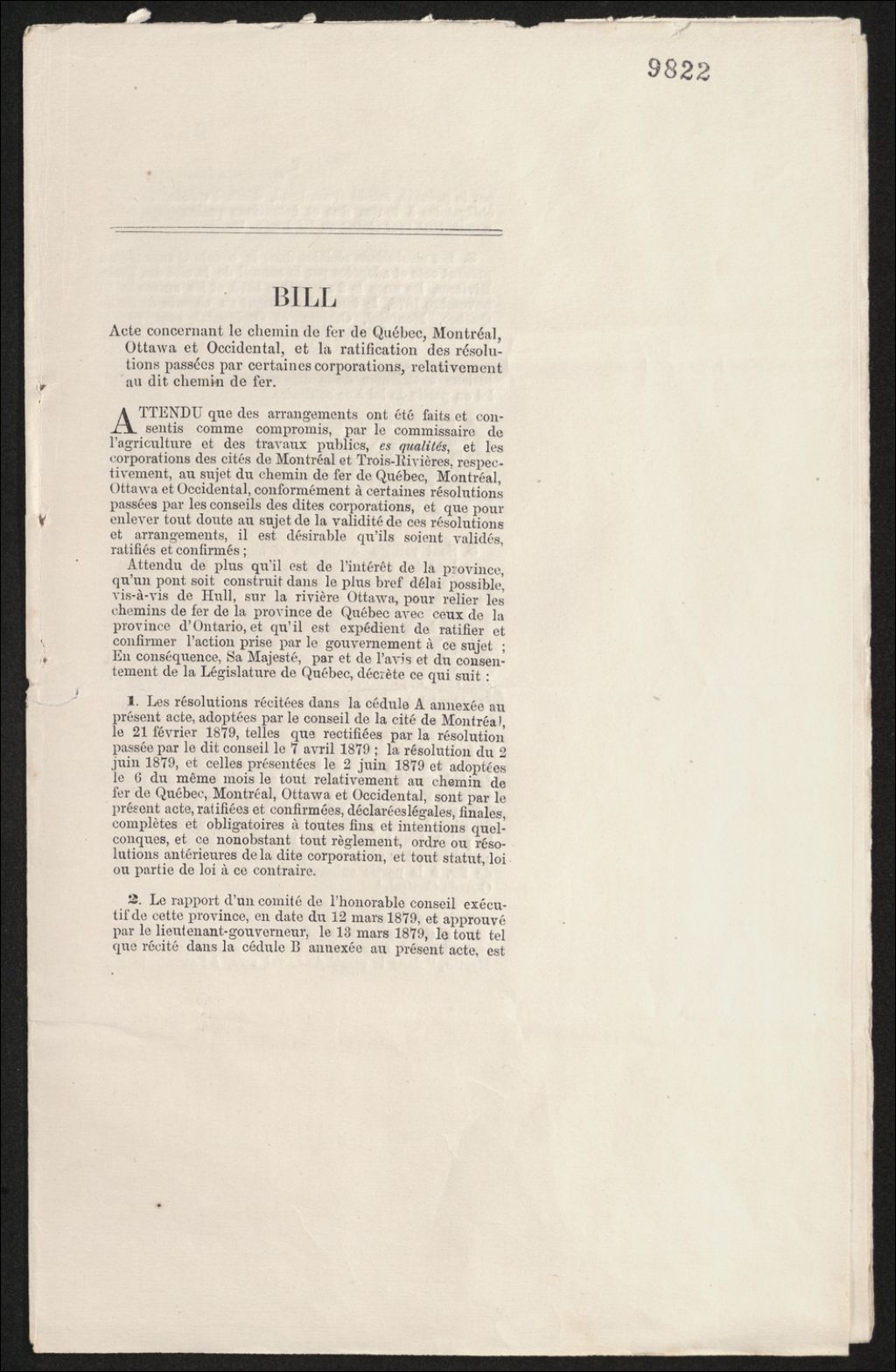 - Acte concernant le chemin de fer de Québec, Montréal, Ottawa et Occidental, et la ratification des résolutions passées par certaines corporations, relativement au dit chemin de feR