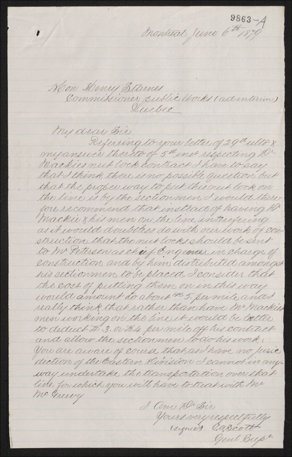 Copie de lettre de C. A. Scott à Henry Starnes, 1879, Archives nationales à Québec, Fonds Famille Joly de Lotbinière, (03Q,P351,S4,SS2,P9863A).