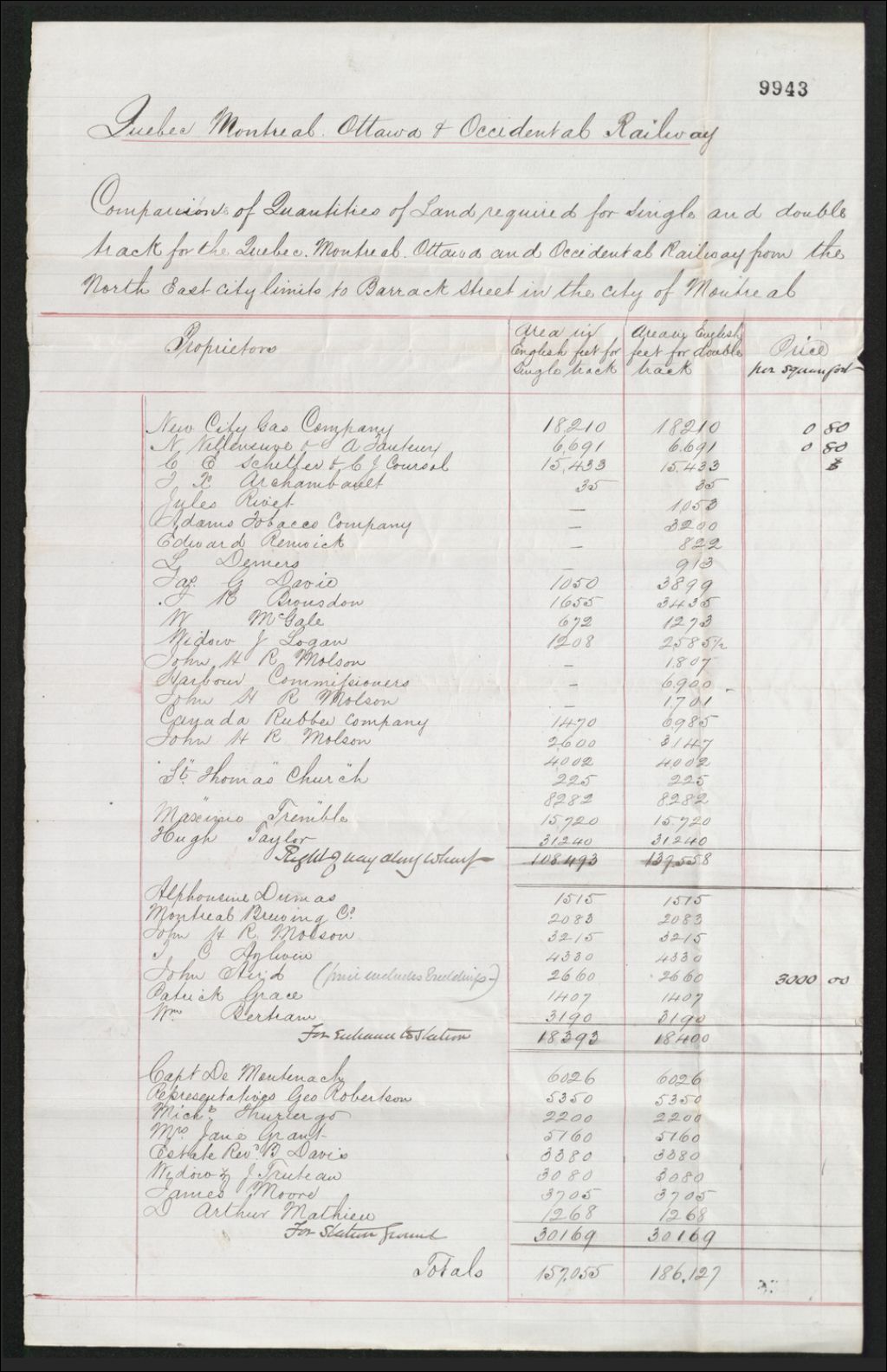 Comparaison des quantités de terrains requises pour une voie ferrée simple ou double, pour le chemin de fer Québec, Montréal, Ottawa et Occidental, dans la ville de Montréal, vers 1879, Archives nationales à Québec, Fonds Famille Joly de Lotbinière, (03Q,P351,S4,SS2,P9943).