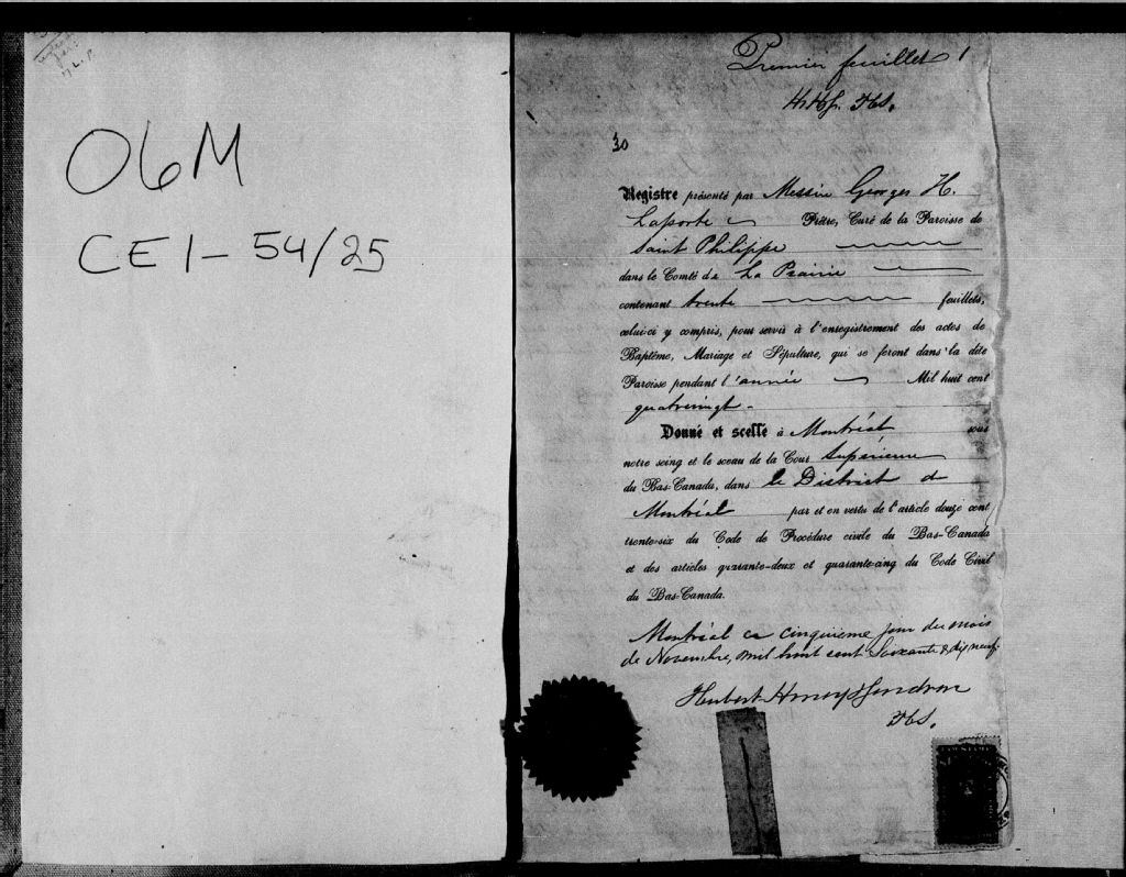 Saint-Philippe, 1752-1922, Archives nationales à Montréal, Fonds Cour supérieure. District judiciaire de Montréal. État civil, (06M,CE601,S54).