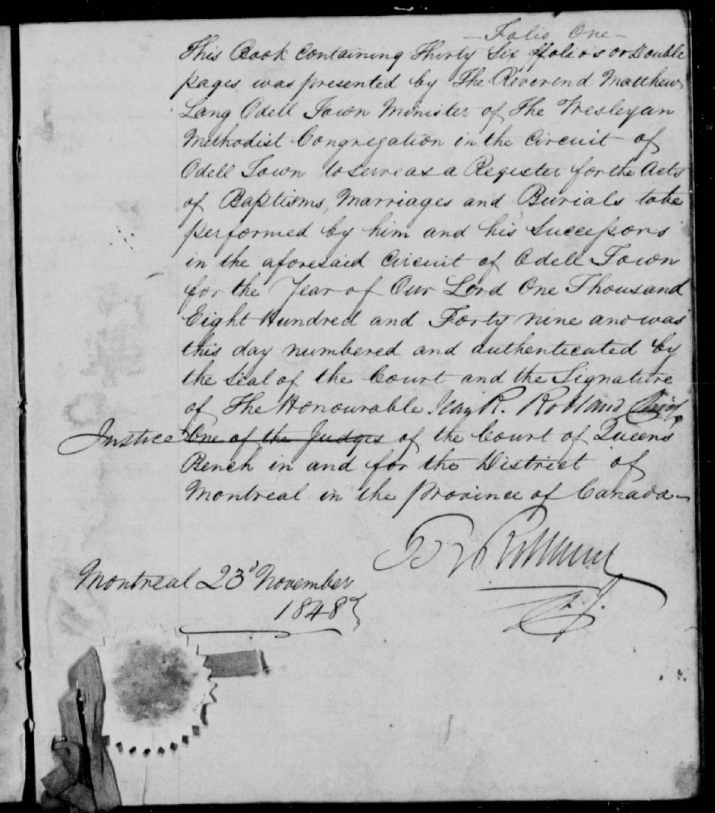Odelltown Methodist Church, 1832-1921, Archives nationales à Montréal, Fonds Cour supérieure. District judiciaire d'Iberville. État civil, (06M,CE604,S31).