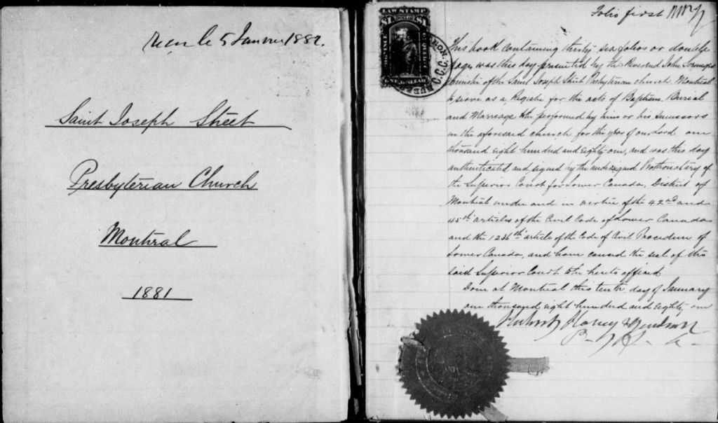 Calvin Presbyterian Church, 1863-1922, Archives nationales à Montréal, Fonds Cour supérieure. District judiciaire de Montréal. État civil, (06M,CE601,S116).