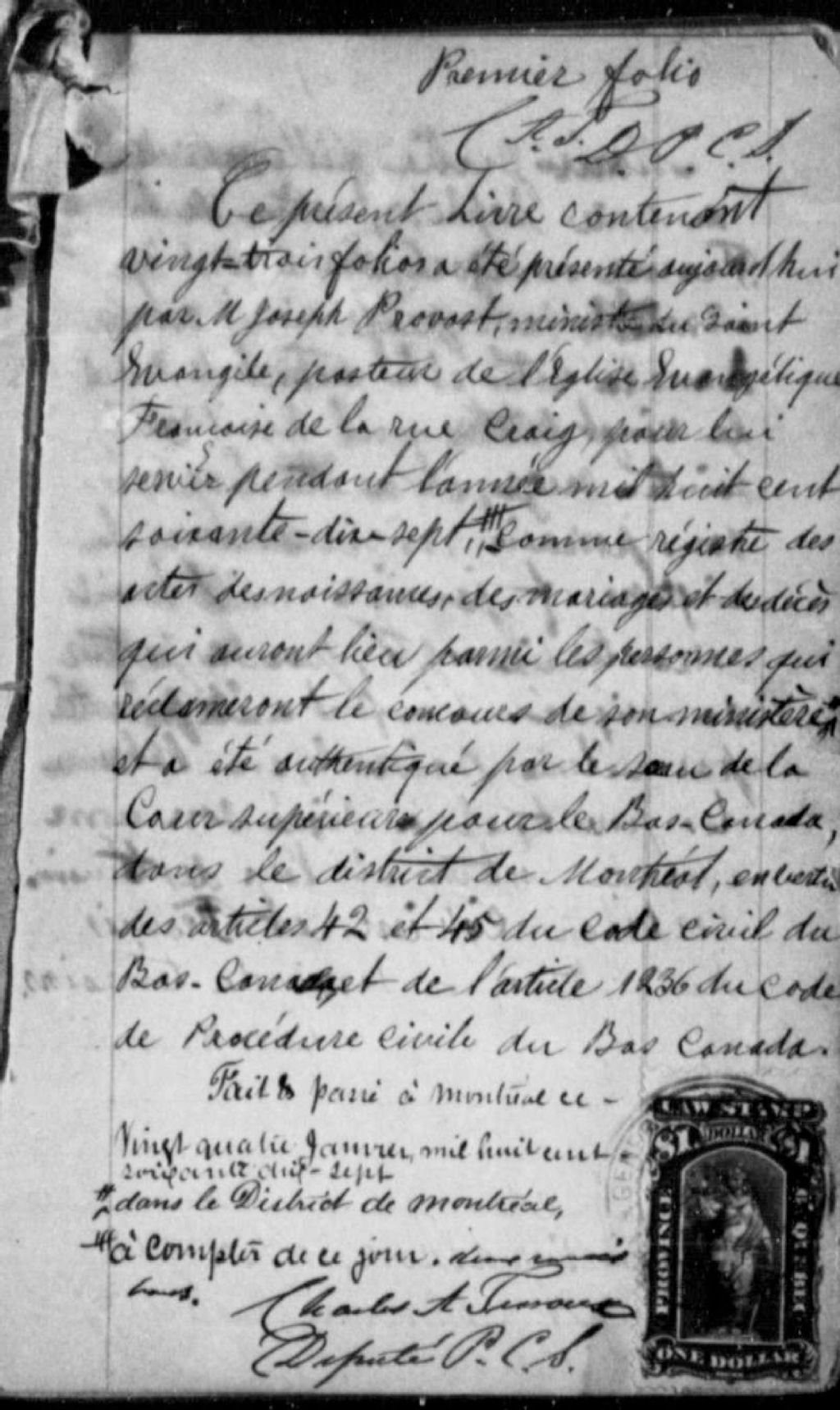 Église évangélique française de Montréal, 1845-1877, Archives nationales à Montréal, Fonds Cour supérieure. District judiciaire de Montréal. État civil, (06M,CE601,S92).