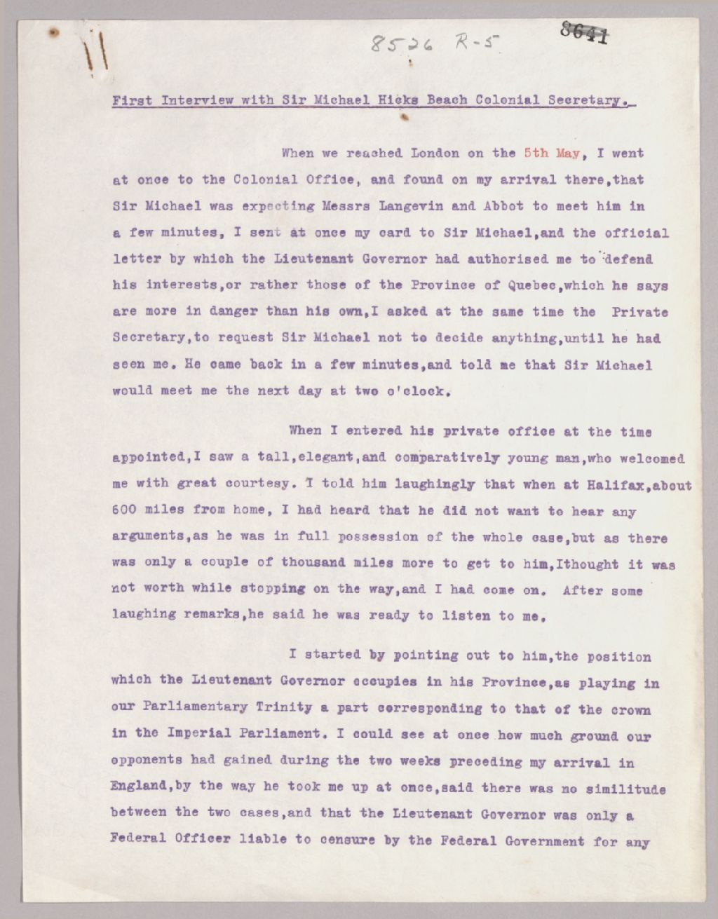 Entrevue entre Henri-Gustave Joly et Sir Michael Hicks Beach, 1879, Archives nationales à Québec, Fonds Famille Joly de Lotbinière, (03Q,P351,S4,SS2,P8526R-5).