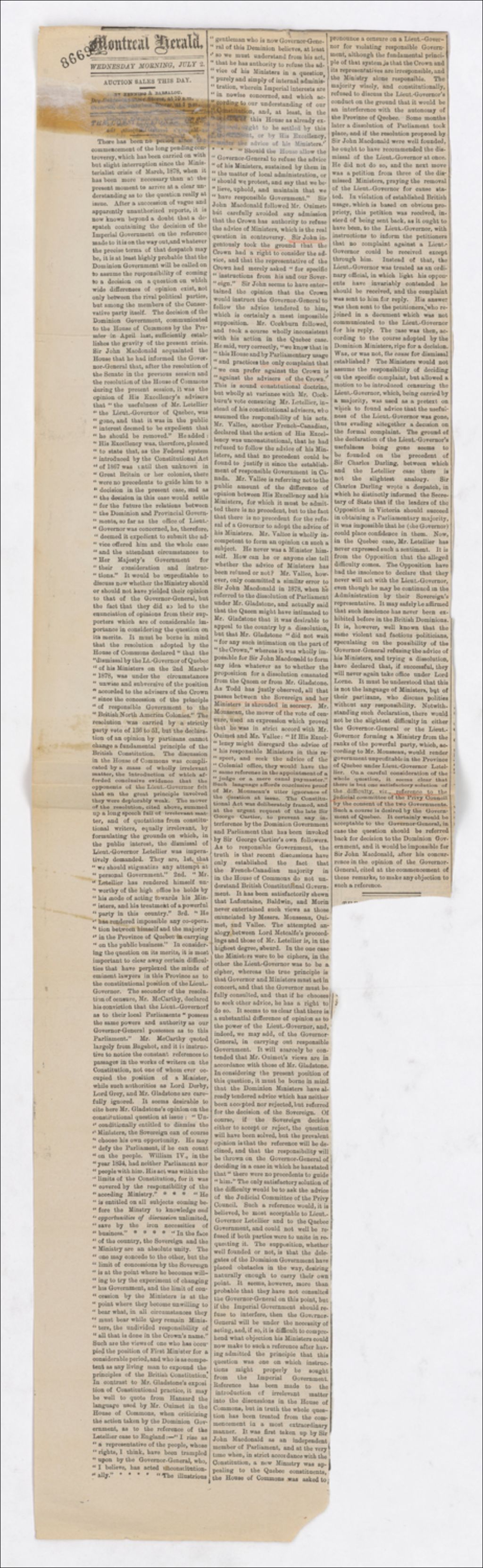 Extrait du Montreal Herald, 2 juillet 1878, Archives nationales à Québec, Fonds Famille Joly de Lotbinière, (03Q,P351,S4,SS2,P8669).