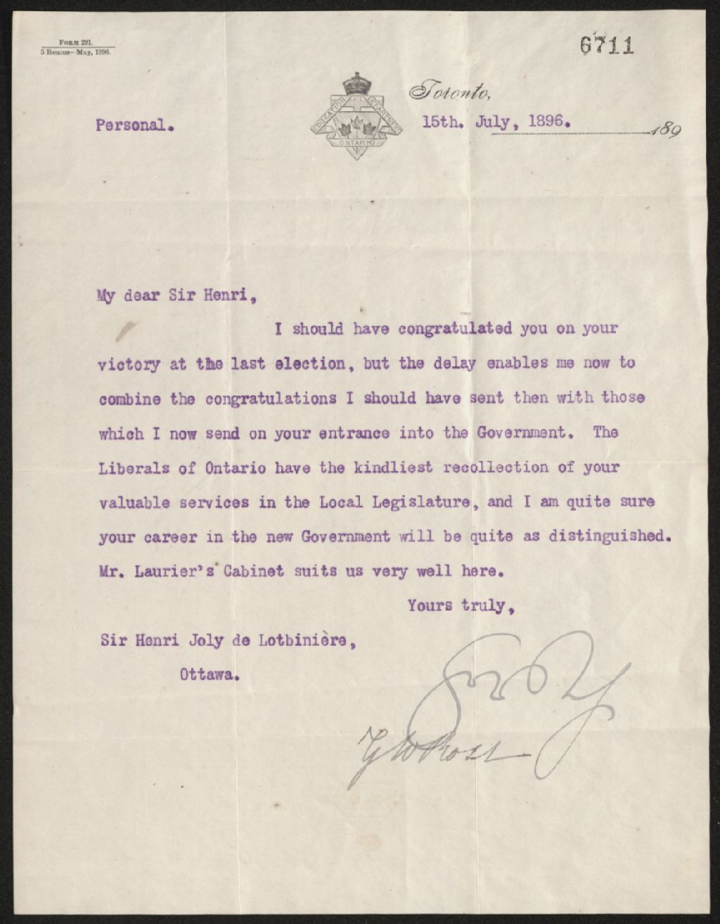 Lettre de G. W. Ross à Henri-Gustave Joly, 15 juillet 1896, Archives nationales à Québec, Fonds Famille Joly de Lotbinière, (03Q,P351,S4,SS1,P6711).