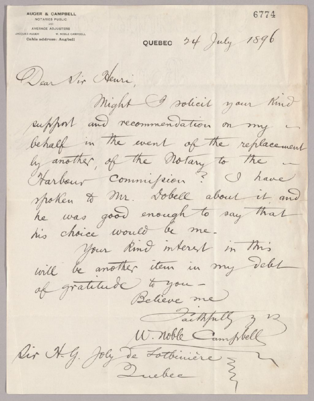 - Joly pourrait-il le supporter et le recommander au cas où on remplacerait le notaire de la commission du port. A parlé à ce sujet à Dobell; ce dernier l'appuiera