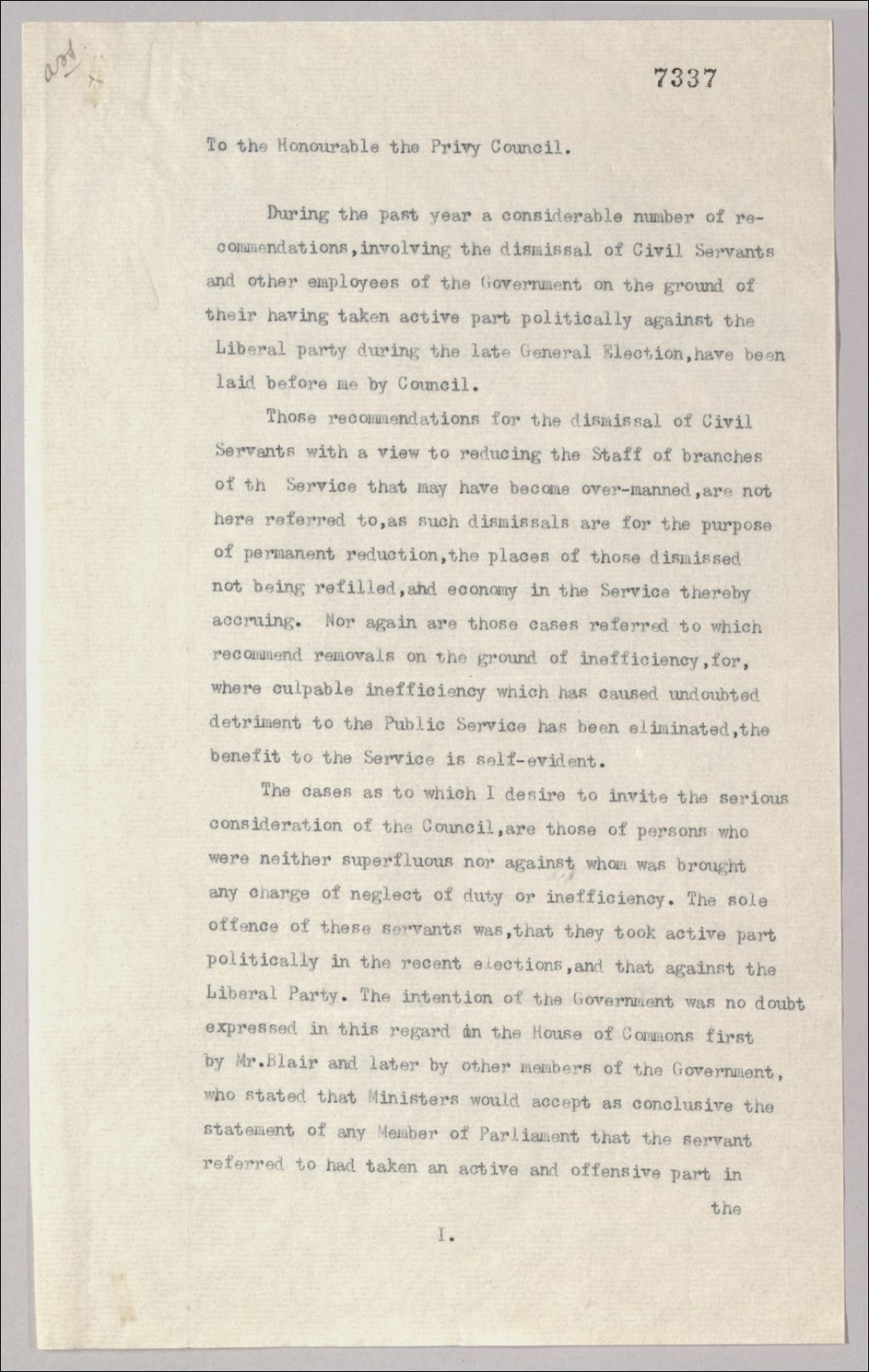 - [Dactylo.] Démission des employés du Gouvernement qui ont pris une part active, dans les dernières élections générales, contre le parti libéral. Réclame un statut pour protéger le service civil et refuse de démettre un officier pour une cause autre que l'incompétence ou inconduite. Propose la réforme du service civil et la neutralité des officiers, etc