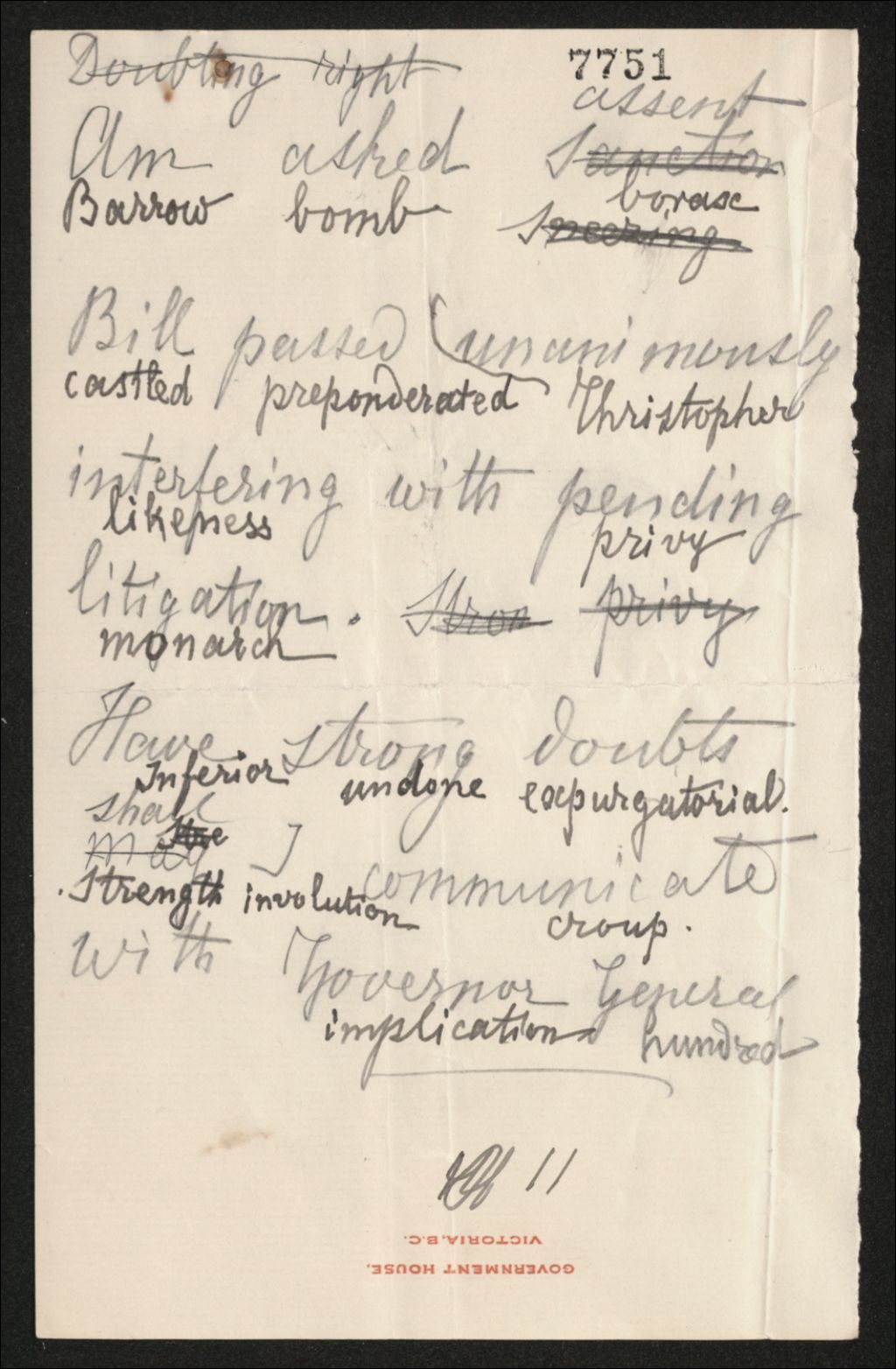 Demande pour l'assentiment du bill adopté à l'unanimité entravant le litige. Conserve de sérieux doutes. Doit-il communiquer avec le gouverneur général
