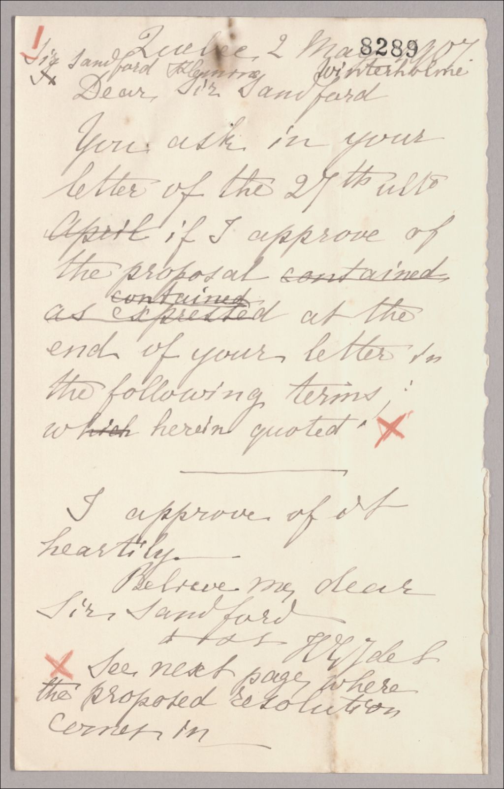 Brouillon de lettre de Henri-Gustave Joly à Sandford Fleming, 2 mai 1907, Archives nationales à Québec, Fonds Famille Joly de Lotbinière, (03Q,P351,S4,SS1,P8289).
