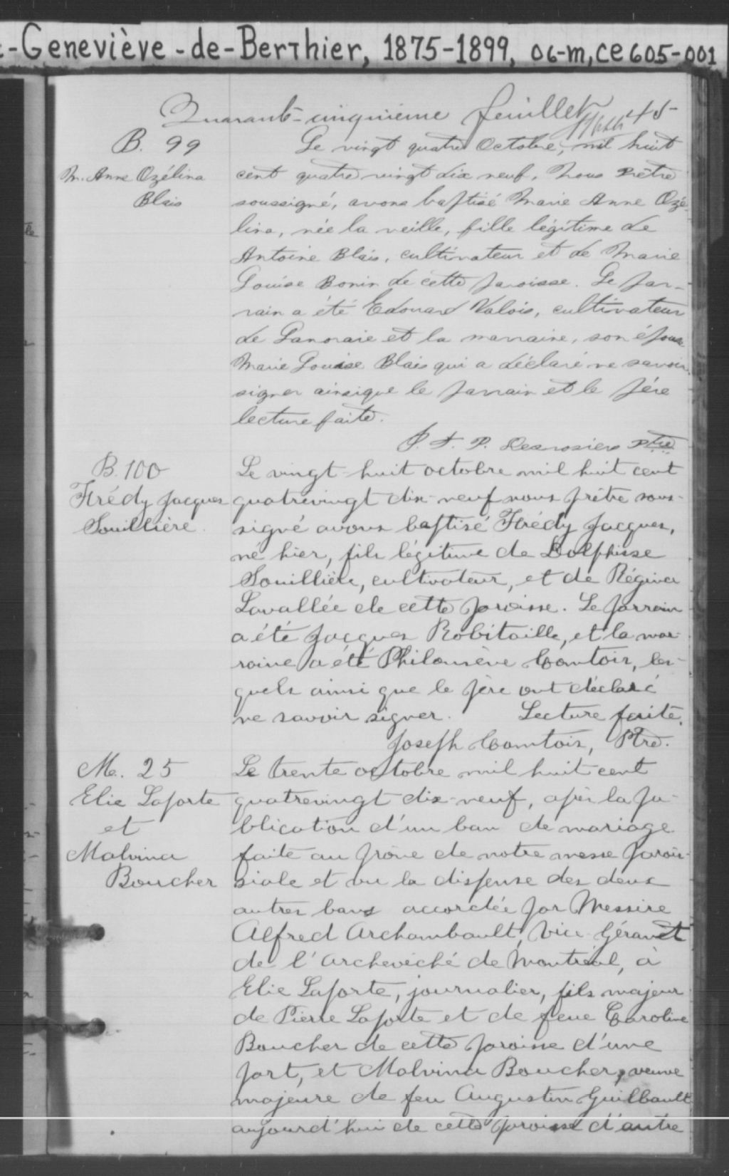 Sainte-Geneviève-de-Berthier, 1722-1920, Archives nationales à Montréal, Fonds Cour supérieure. District judiciaire de Joliette. État civil, (06M,CE605,S1).