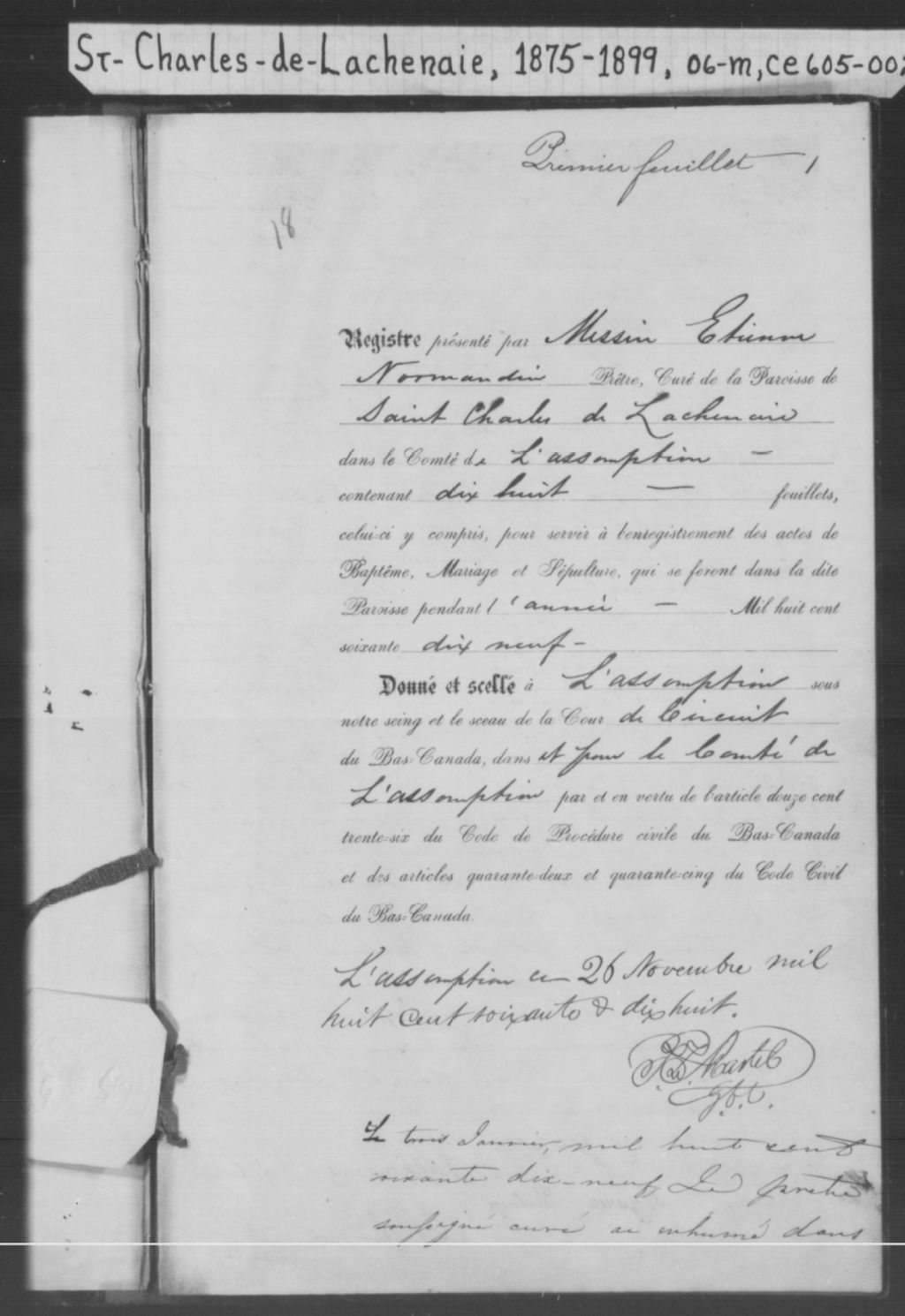 Saint-Charles-de-Lachenaie, 1685-1921, Archives nationales à Montréal, Fonds Cour supérieure. District judiciaire de Joliette. État civil, (06M,CE605,S2).