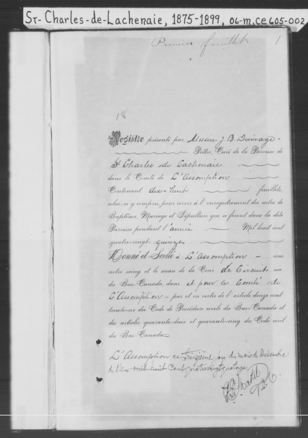 Saint-Charles-de-Lachenaie, 1685-1921, Archives nationales à Montréal, Fonds Cour supérieure. District judiciaire de Joliette. État civil, (06M,CE605,S2).