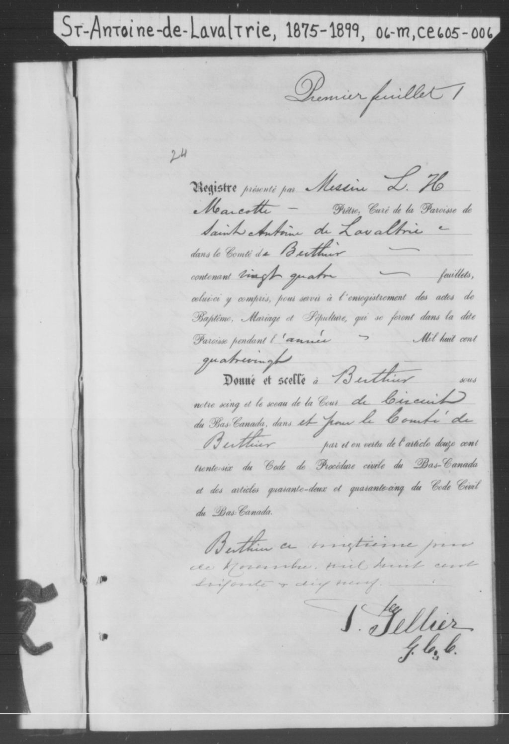 Saint-Antoine-de-Lavaltrie, 1749-1921, Archives nationales à Montréal, Fonds Cour supérieure. District judiciaire de Joliette. État civil, (06M,CE605,S6).