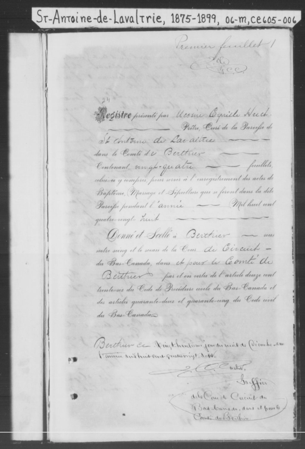 Saint-Antoine-de-Lavaltrie, 1749-1921, Archives nationales à Montréal, Fonds Cour supérieure. District judiciaire de Joliette. État civil, (06M,CE605,S6).