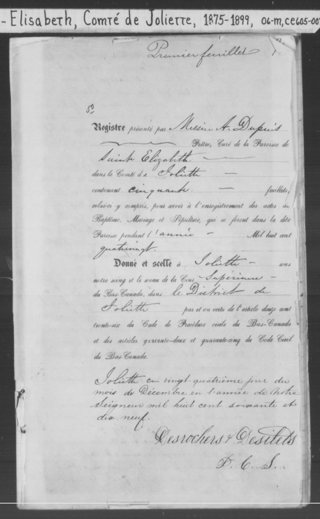 Sainte-Élisabeth, 1802-1921, Archives nationales à Montréal, Fonds Cour supérieure. District judiciaire de Joliette. État civil, (06M,CE605,S7).