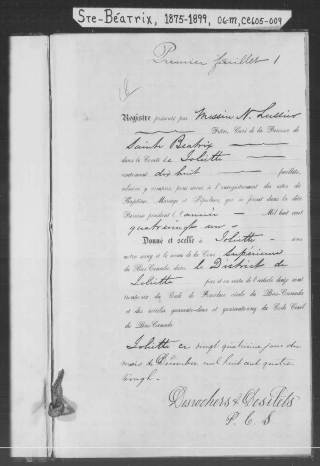 Sainte-Béatrix, 1861-1921, Archives nationales à Montréal, Fonds Cour supérieure. District judiciaire de Joliette. État civil, (06M,CE605,S9).