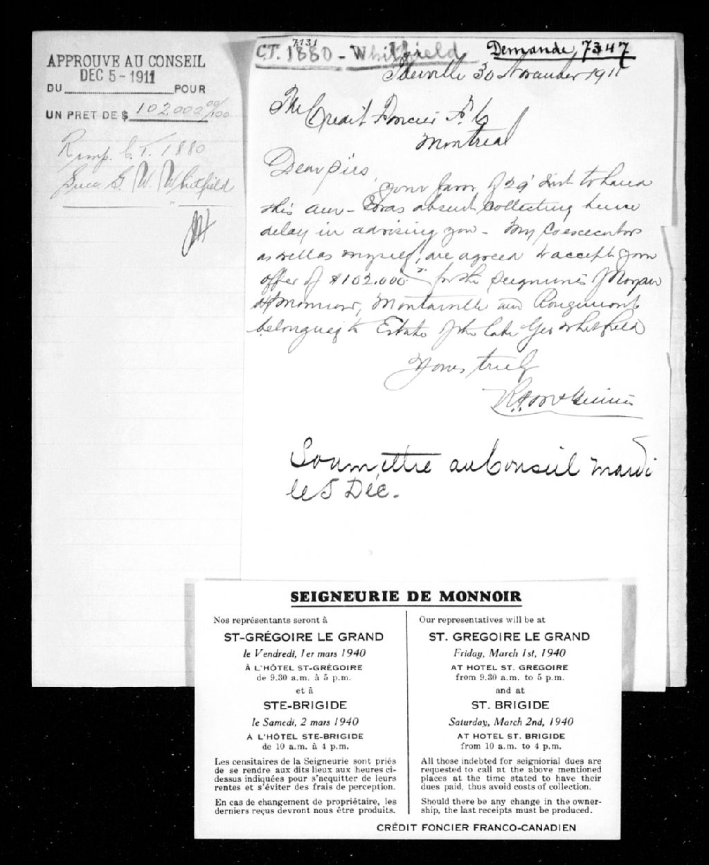 - Ce dossier est constitué de correspondance échangée entre le Crédit foncier franco-canadien et les censitaires au sujet des rentes