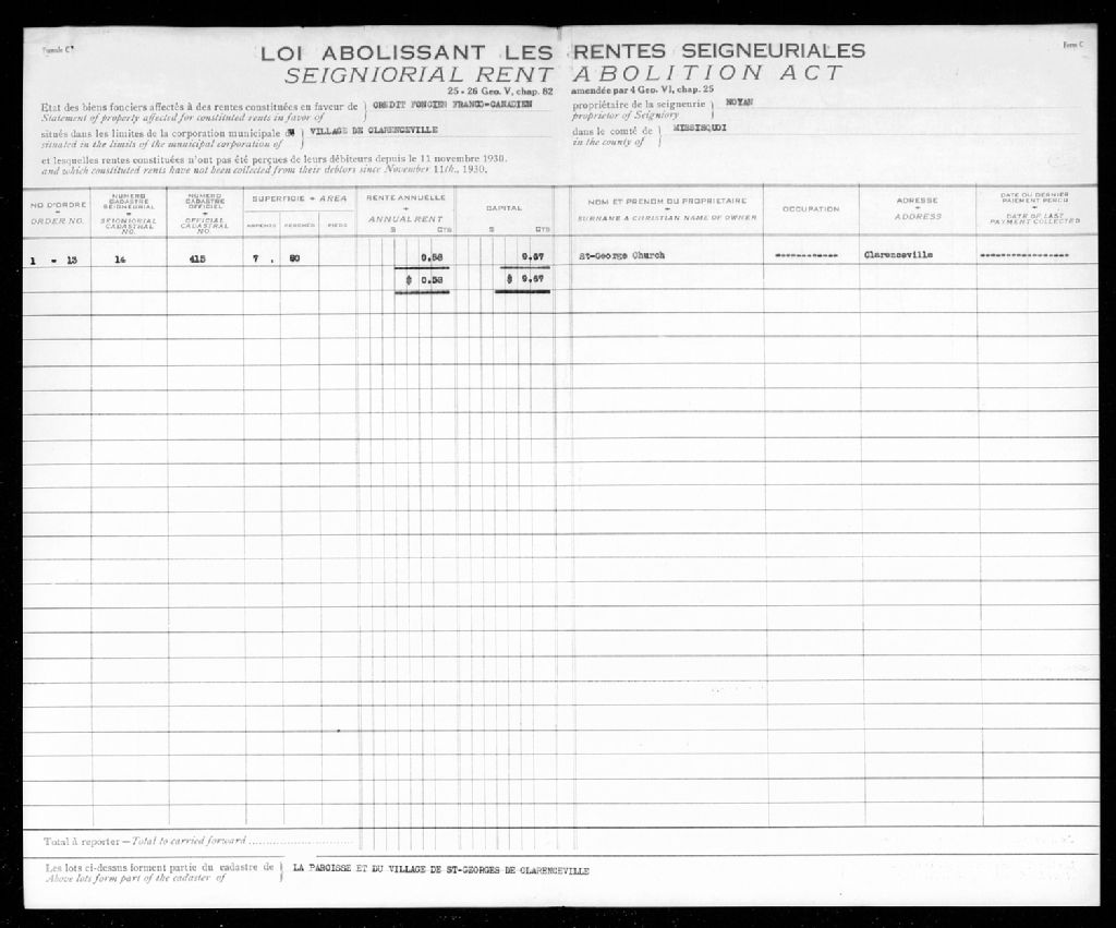 Déclaration du Crédit foncier franco-canadien concernant les rentes seigneuriales pour le village de Clarenceville et les paroisses Saint-Thomas, Saint-Georges-de-Clarenceville et Saint-Pierre-de-Véronne, 1940, Archives nationales à Montréal, Fonds seigneuries de la région de Montréal, (06M,P167,S22,D9).