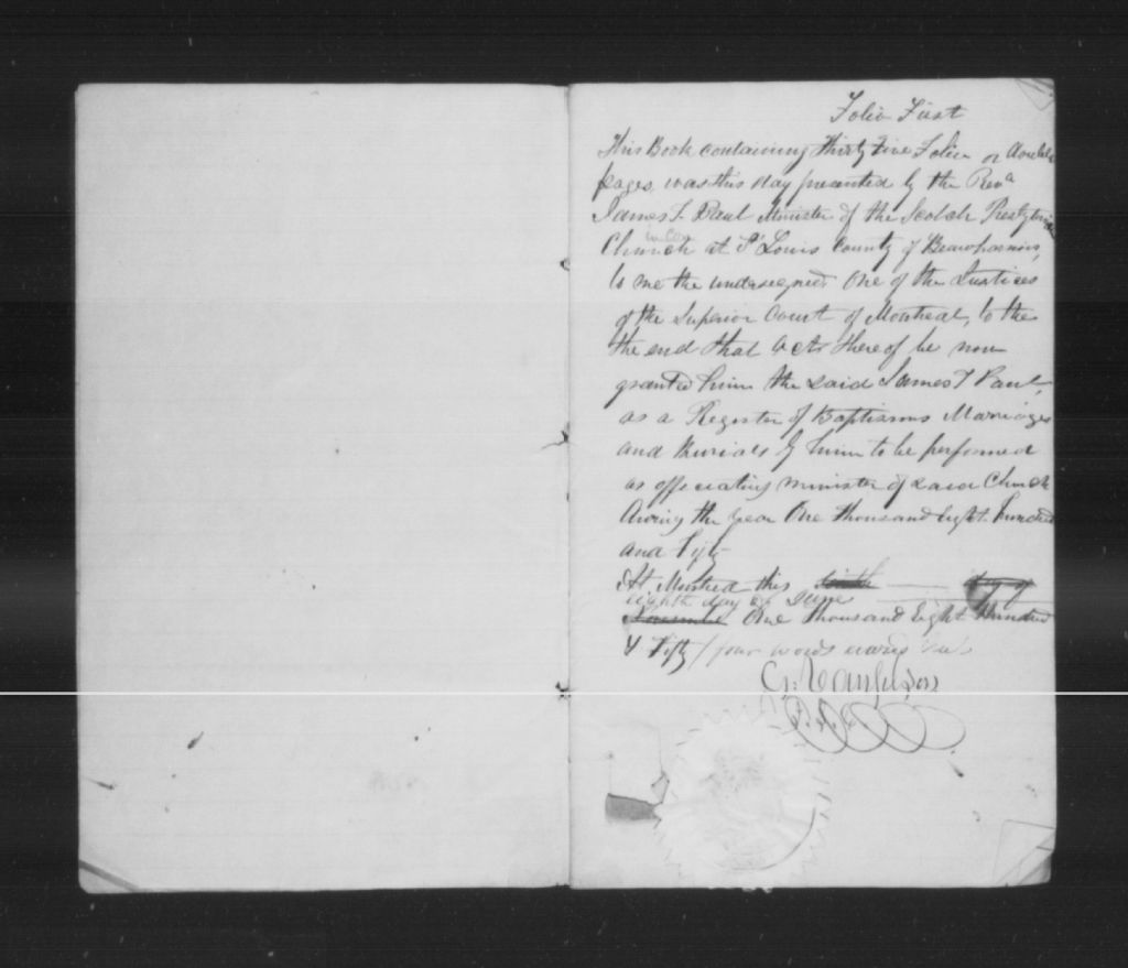 St. Louis de Gonzague Church of Scotland, 1850-1872, Archives nationales à Montréal, Fonds Cour supérieure. District judiciaire de Beauharnois. État civil, (06M,CE607,S67).