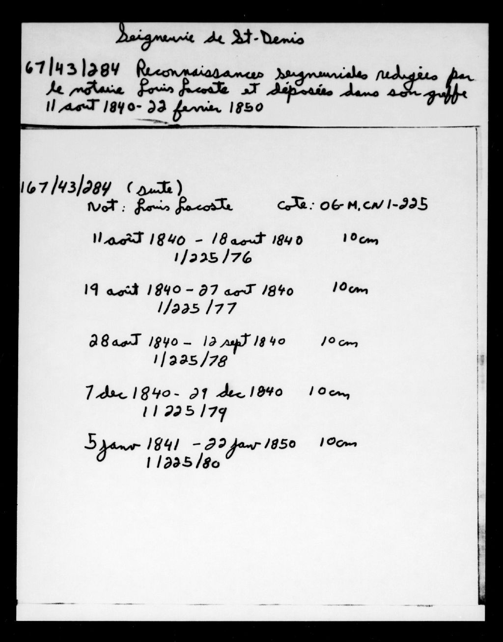 Reconnaissances seigneuriales rédigées par le notaire Louis Lacoste et déposées dans son greffe, 11 août 1840-22 février 1850, Archives nationales à Montréal, Fonds seigneuries de la région de Montréal, (06M,P167,S27,D1).
