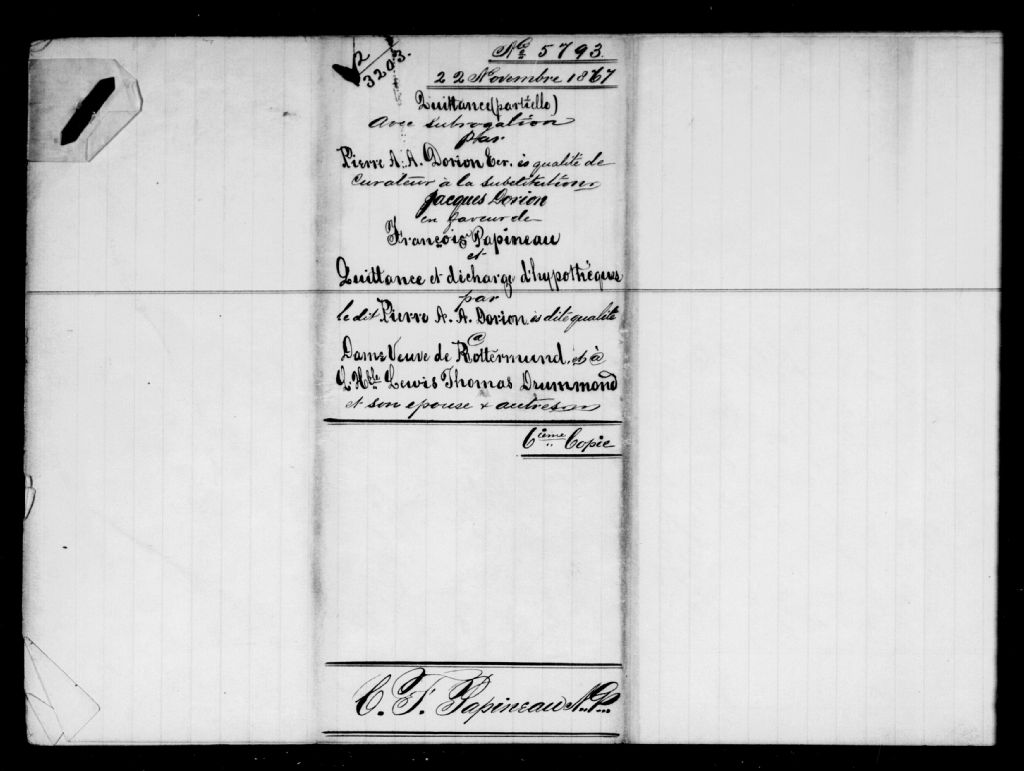 - Ce dossier contient une quittance partielle et quittance d'hypothèque (1867), une quittance partielle (1874), des quittances générales, finales et réciproques (1874), vente et transport de rentes constituées seigneuriales (1879), transfert de seigneurie (1881 et 1882) et 6 transferts (1883-1884)