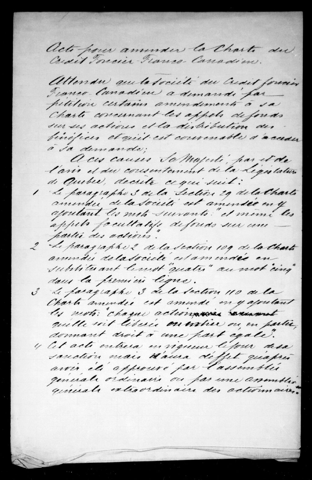 Projet de loi pour amender la charte du Crédit foncier franco-canadien, [Vers 1900], Archives nationales à Montréal, Fonds seigneuries de la région de Montréal, (06M,P167,S30,D4).