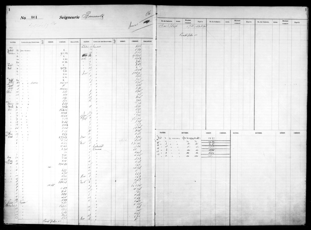 - Registre donnant les débits, crédits et balances dues de diverses seigneuries