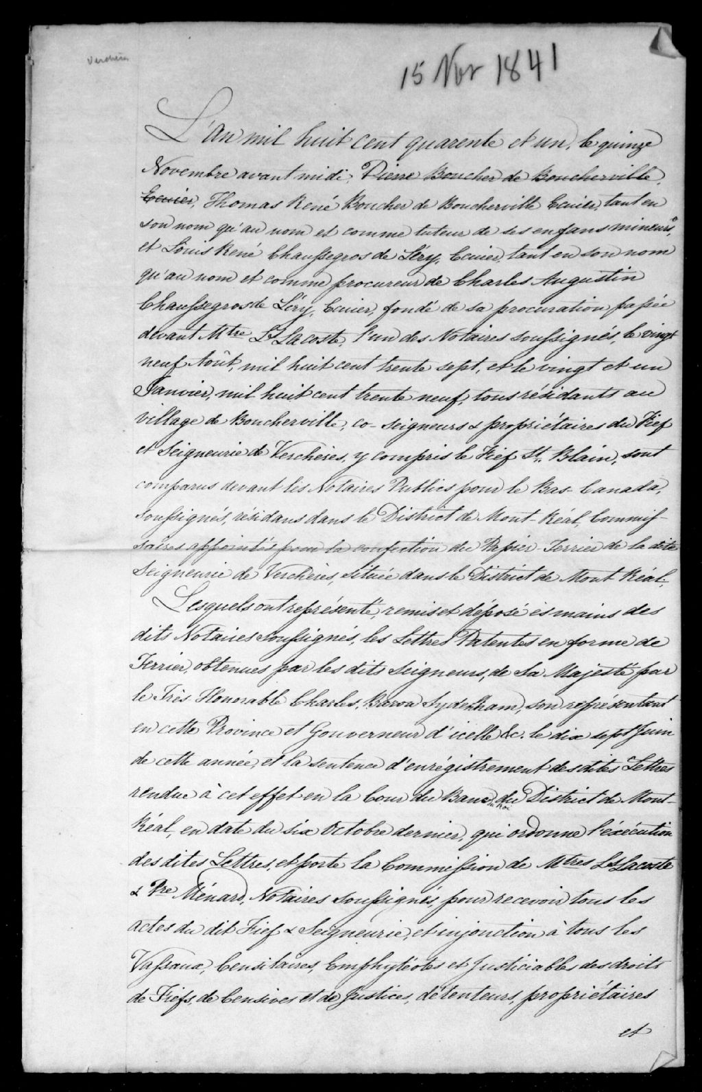 Autorisations requises en vue du papier terrier, 1841, Archives nationales à Montréal, Fonds seigneuries de la région de Montréal, (06M,P167,S30,D6).