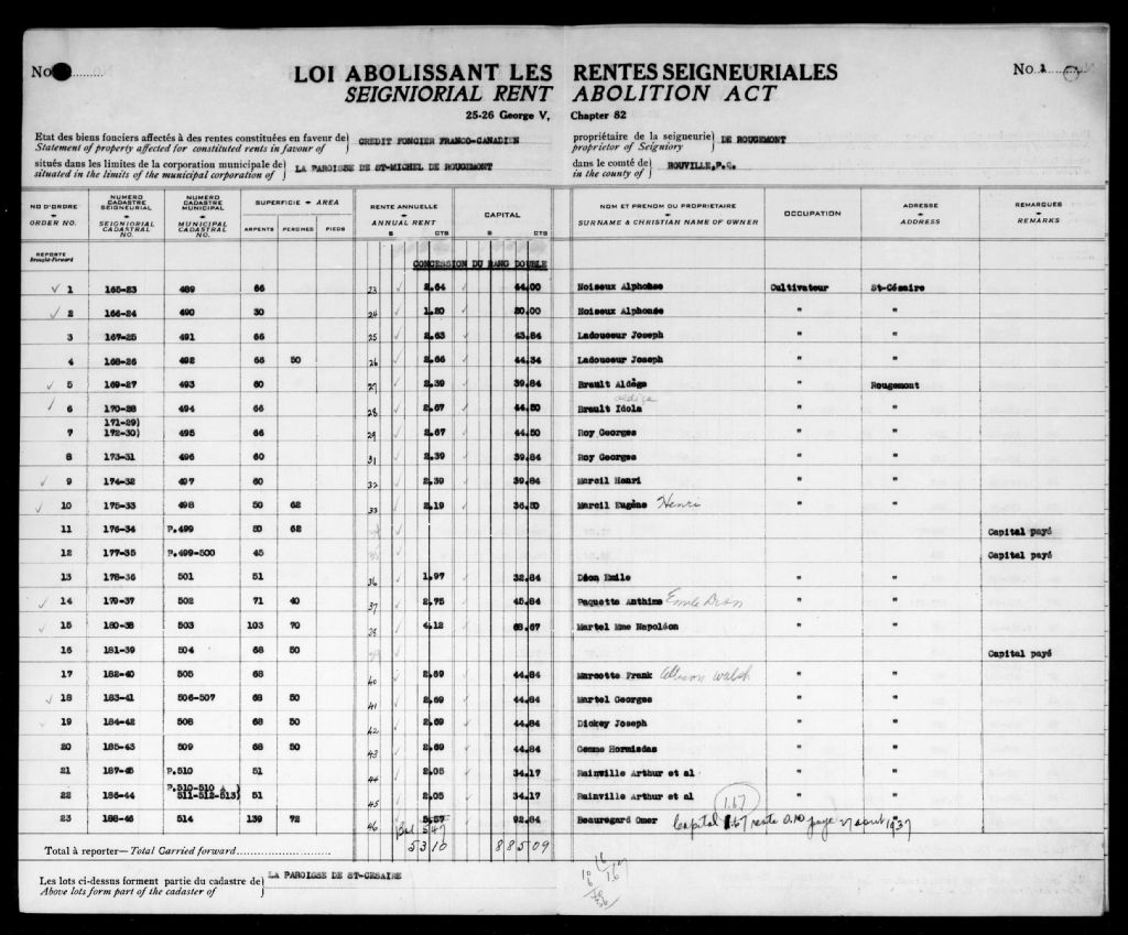Terriers de rentes constituées pour Saint-Césaire, Saint-Michel et L'Ange-Gardien, 1936, Archives nationales à Montréal, Fonds seigneuries de la région de Montréal, (06M,P167,S26,D6).