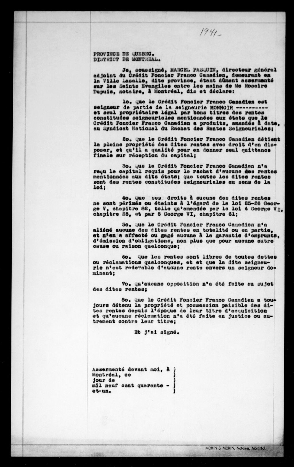 Assermentation du directeur général adjoint du Crédit foncier franco-canadien comme seigneur et seul propriétaire légal des seigneuries de Monnoir, Montarville, Noyan et Rougemont, 1941, Archives nationales à Montréal, Fonds seigneuries de la région de Montréal, (06M,P167,S26,D9).