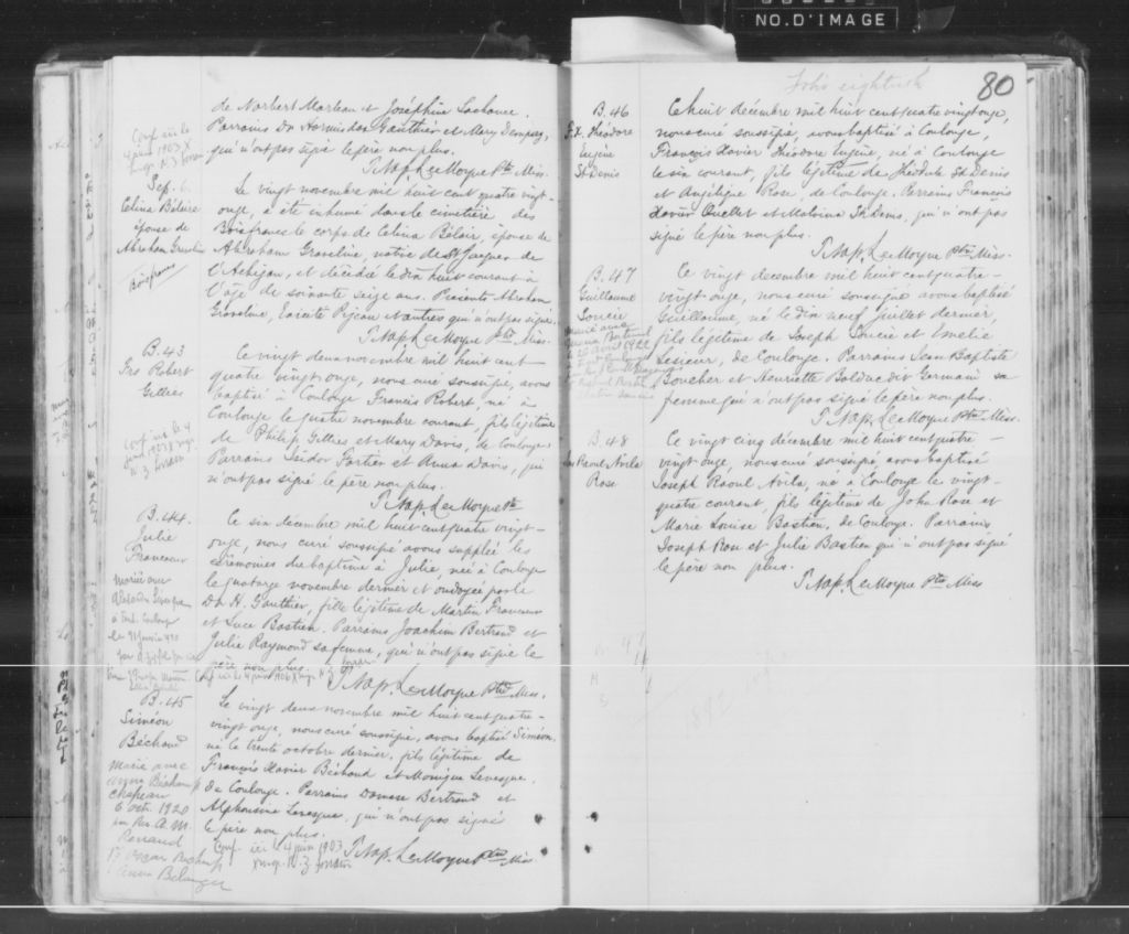 Incluant les entrées pour la mission/paroisse Saint-Antoine-de-Padoue de Bois-Francs, cantons de Mansfield et Pontefract.Curés : T. Napoléon LeMoyne (1894-1900), A.M. Renaud (1900-1907), J. Cam. Dagenais (1909)