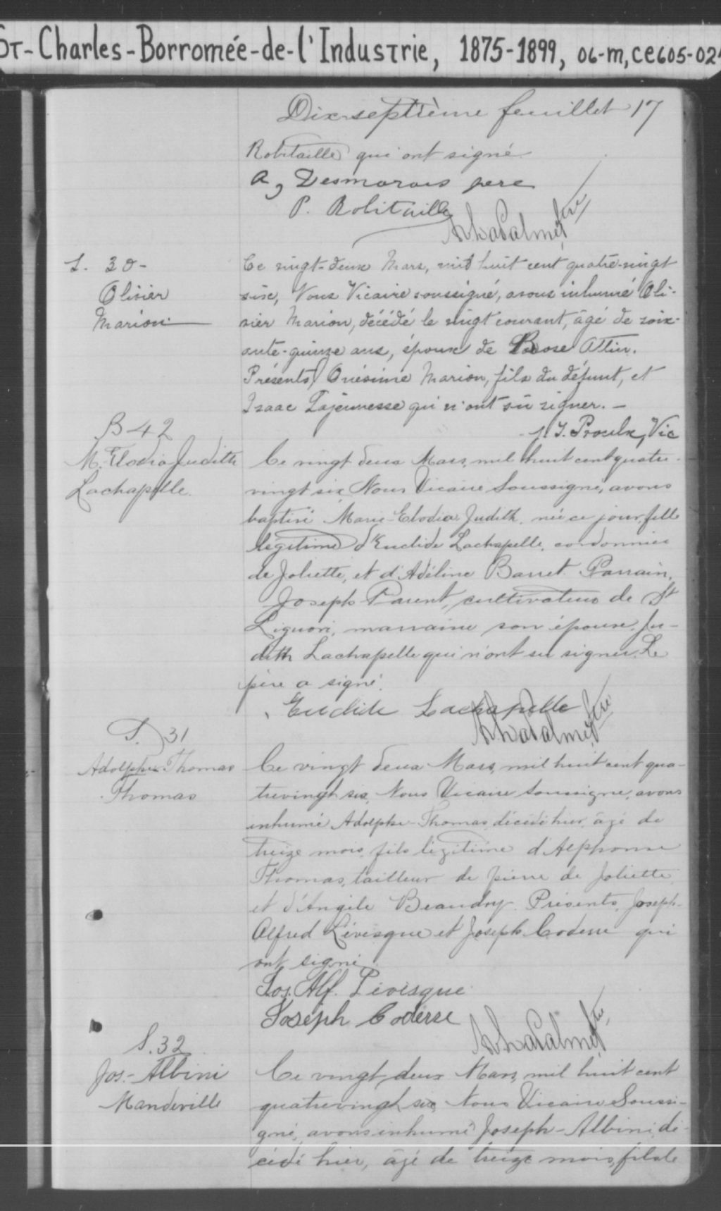Saint-Charles-Borromée-de-l'Industrie, 1843-1921, Archives nationales à Montréal, Fonds Cour supérieure. District judiciaire de Joliette. État civil, (06M,CE605,S24).