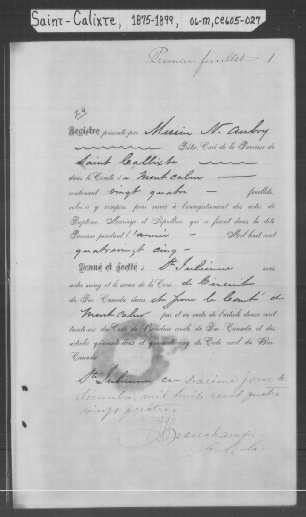 Saint-Calixte, 1854-1921, Archives nationales à Montréal, Fonds Cour supérieure. District judiciaire de Joliette. État civil, (06M,CE605,S27).