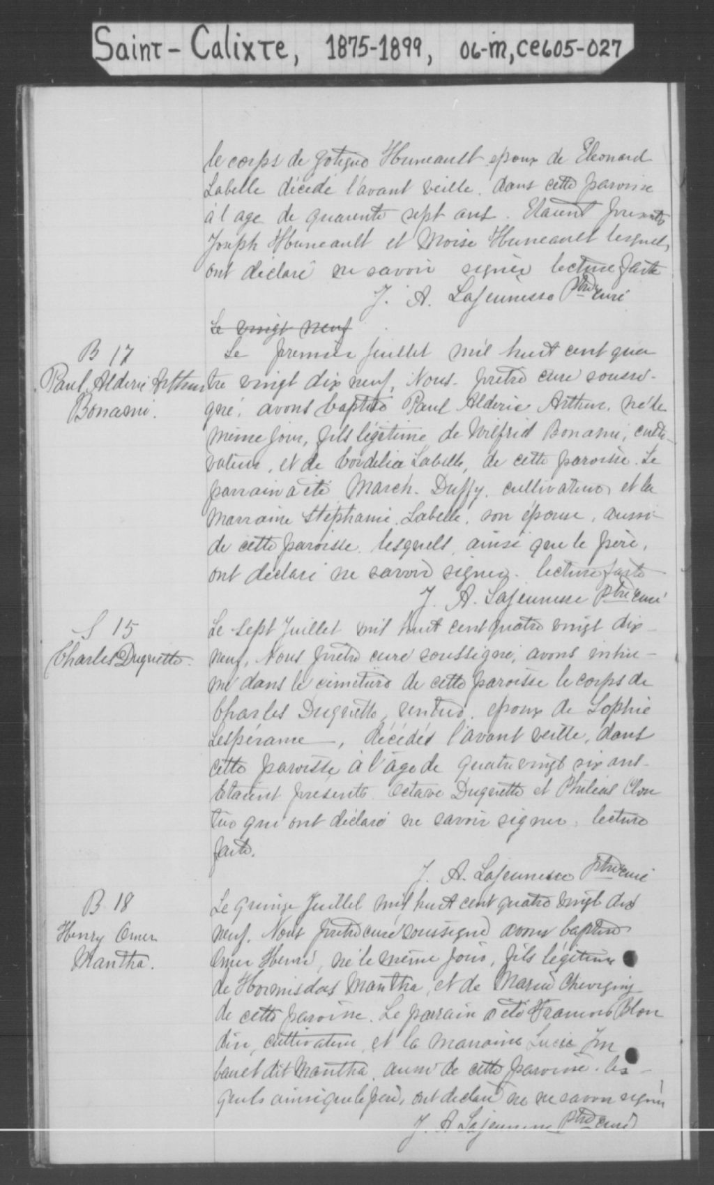 Saint-Calixte, 1854-1921, Archives nationales à Montréal, Fonds Cour supérieure. District judiciaire de Joliette. État civil, (06M,CE605,S27).