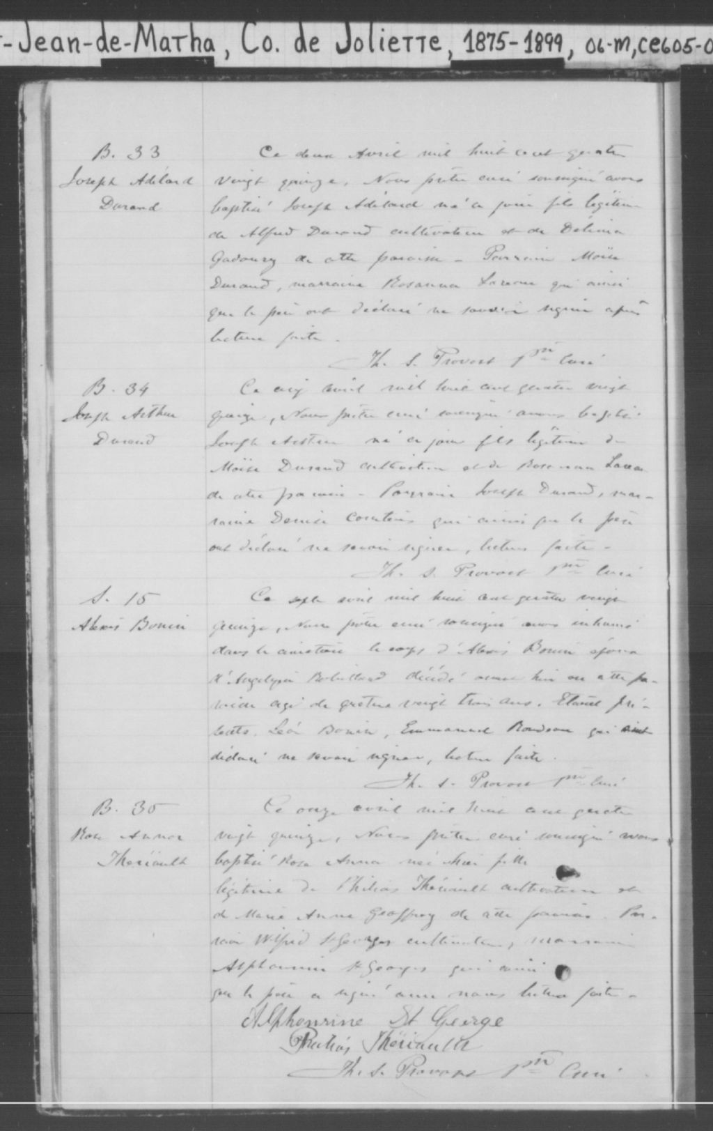 Saint-Jean-de-Matha, 1855-1921, Archives nationales à Montréal, Fonds Cour supérieure. District judiciaire de Joliette. État civil, (06M,CE605,S30).