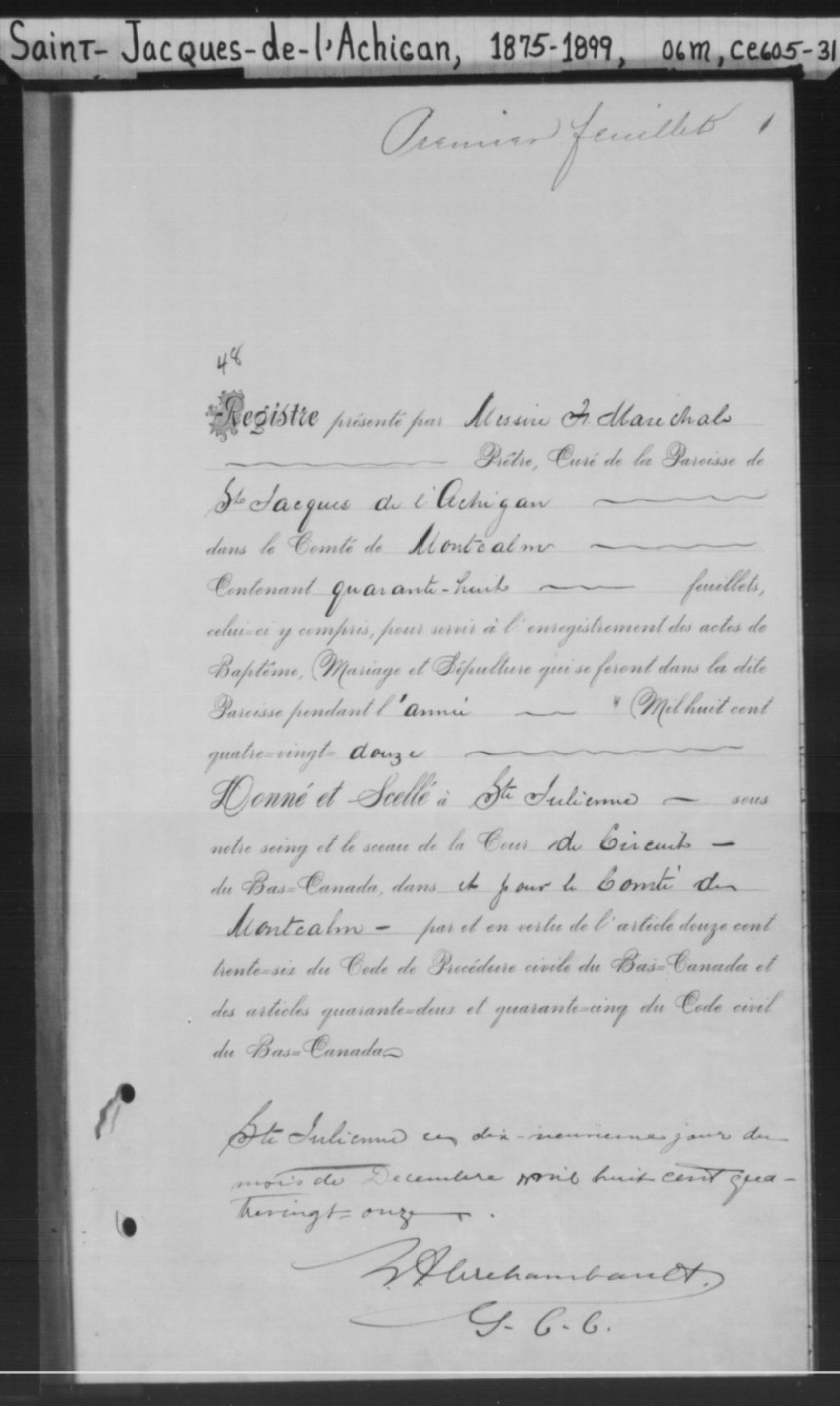 Saint-Jacques-de-l'Achigan, 1774-1921, Archives nationales à Montréal, Fonds Cour supérieure. District judiciaire de Joliette. État civil, (06M,CE605,S31).